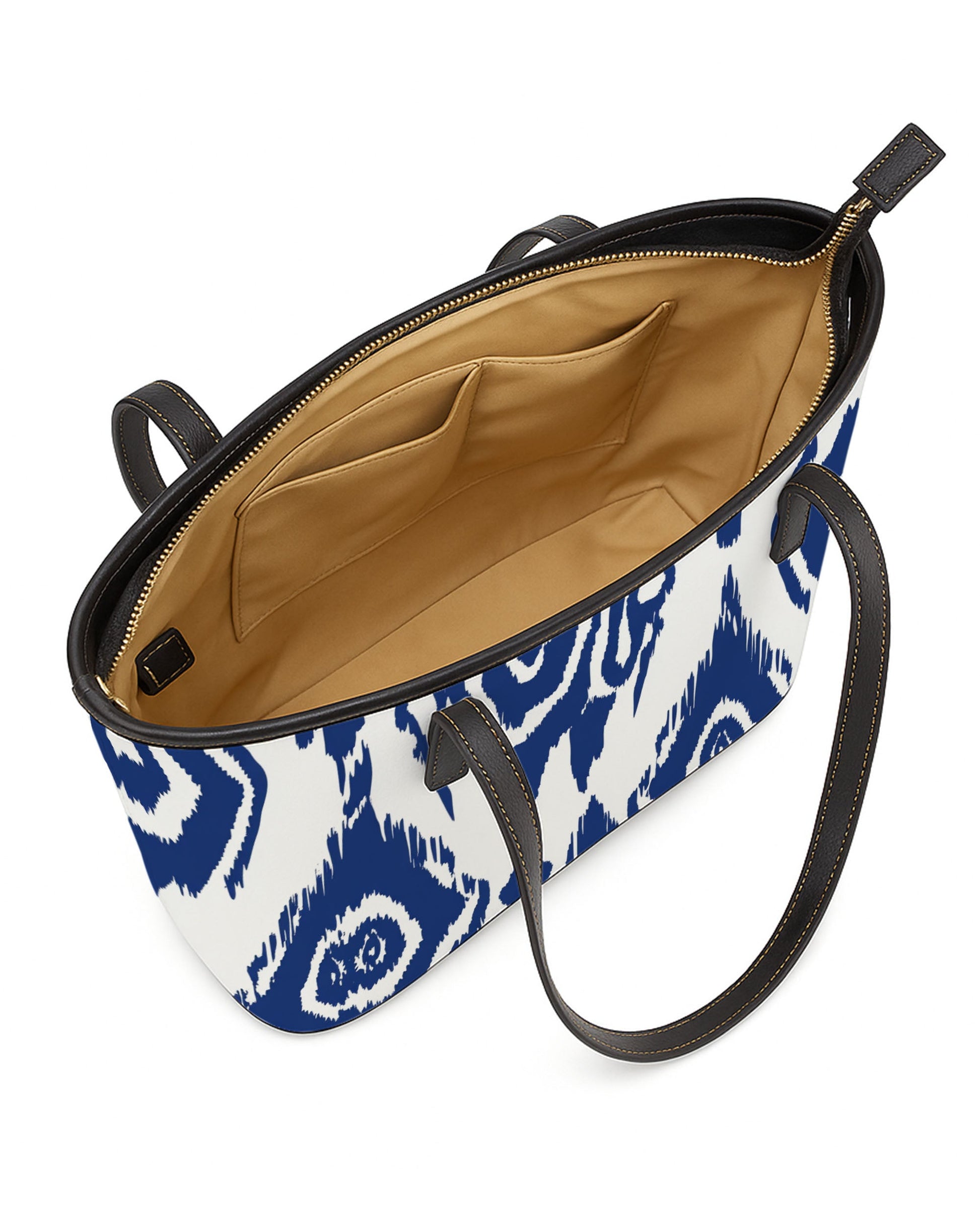 The bag is designed for daily convenience. A spacious, beige-lined interior features slip pockets and ample storage, ideal for organizing your essentials neatly. Secured by a smooth zipper closure, and complemented by adjustable black leather handles, it combines personalized flair with functional design—perfect for everyday outings, shopping trips, or work essentials.