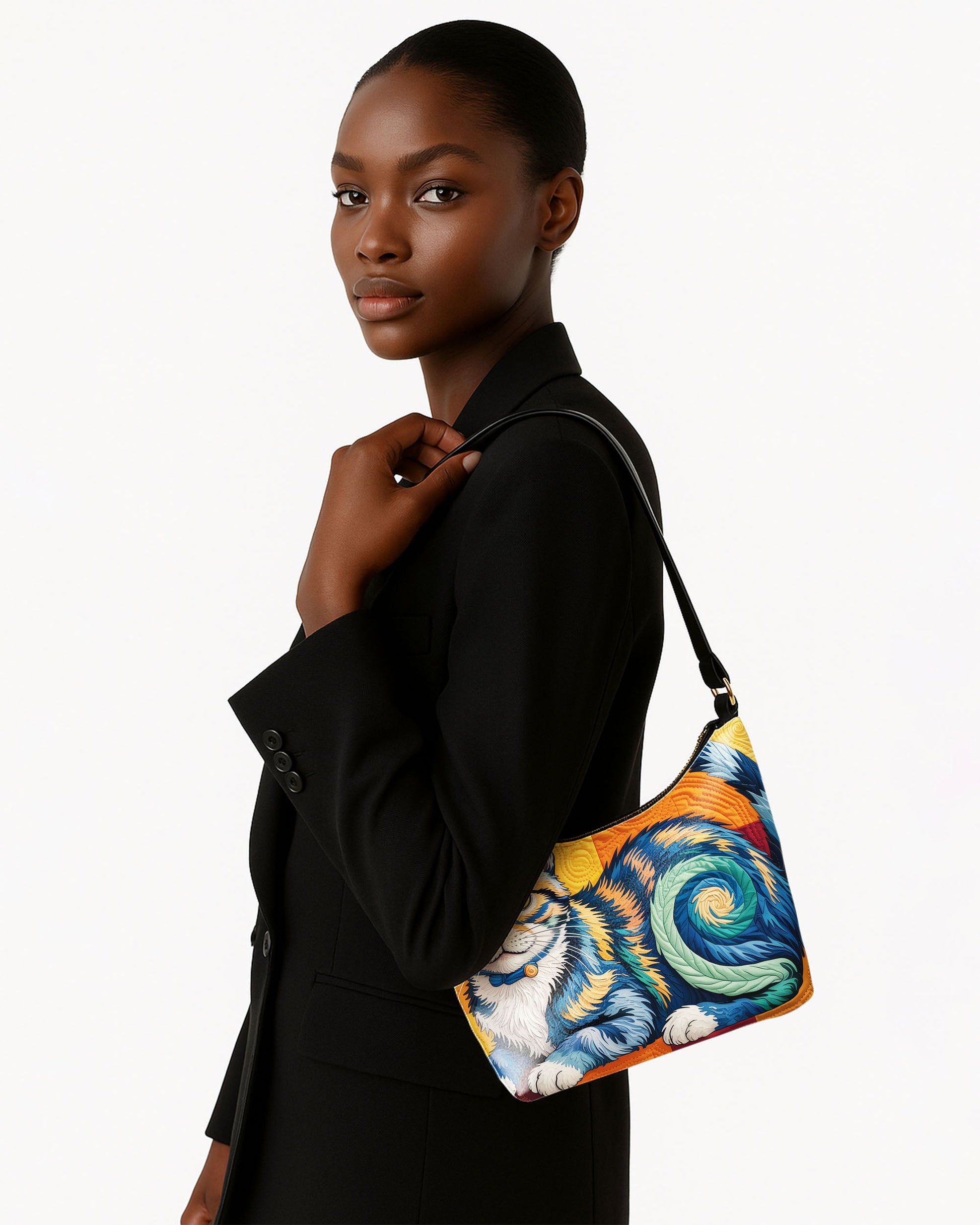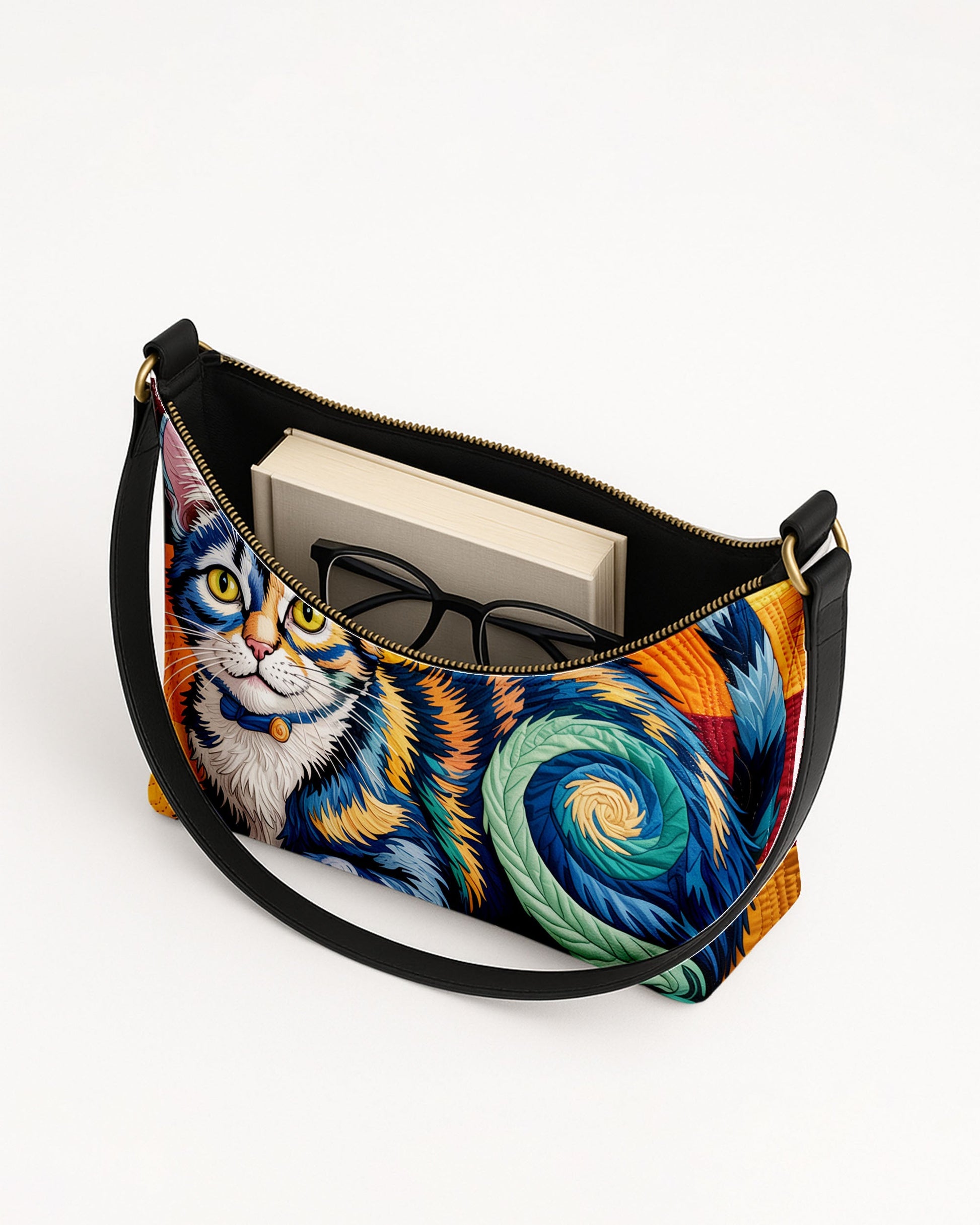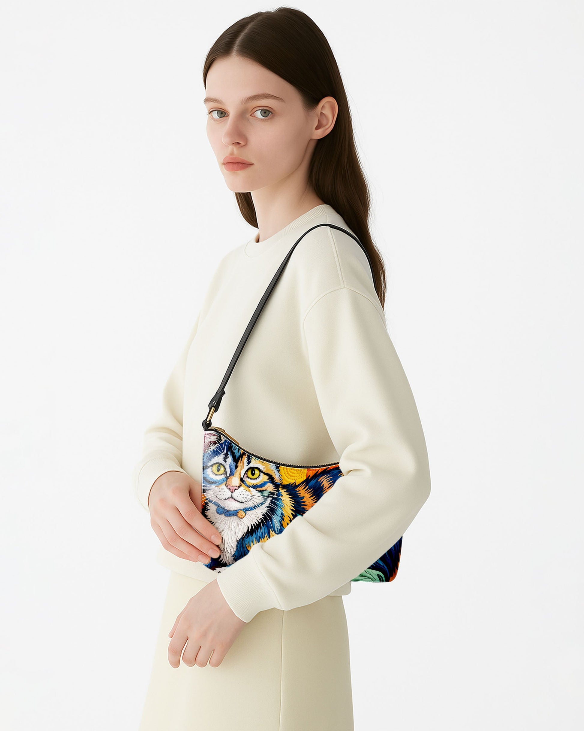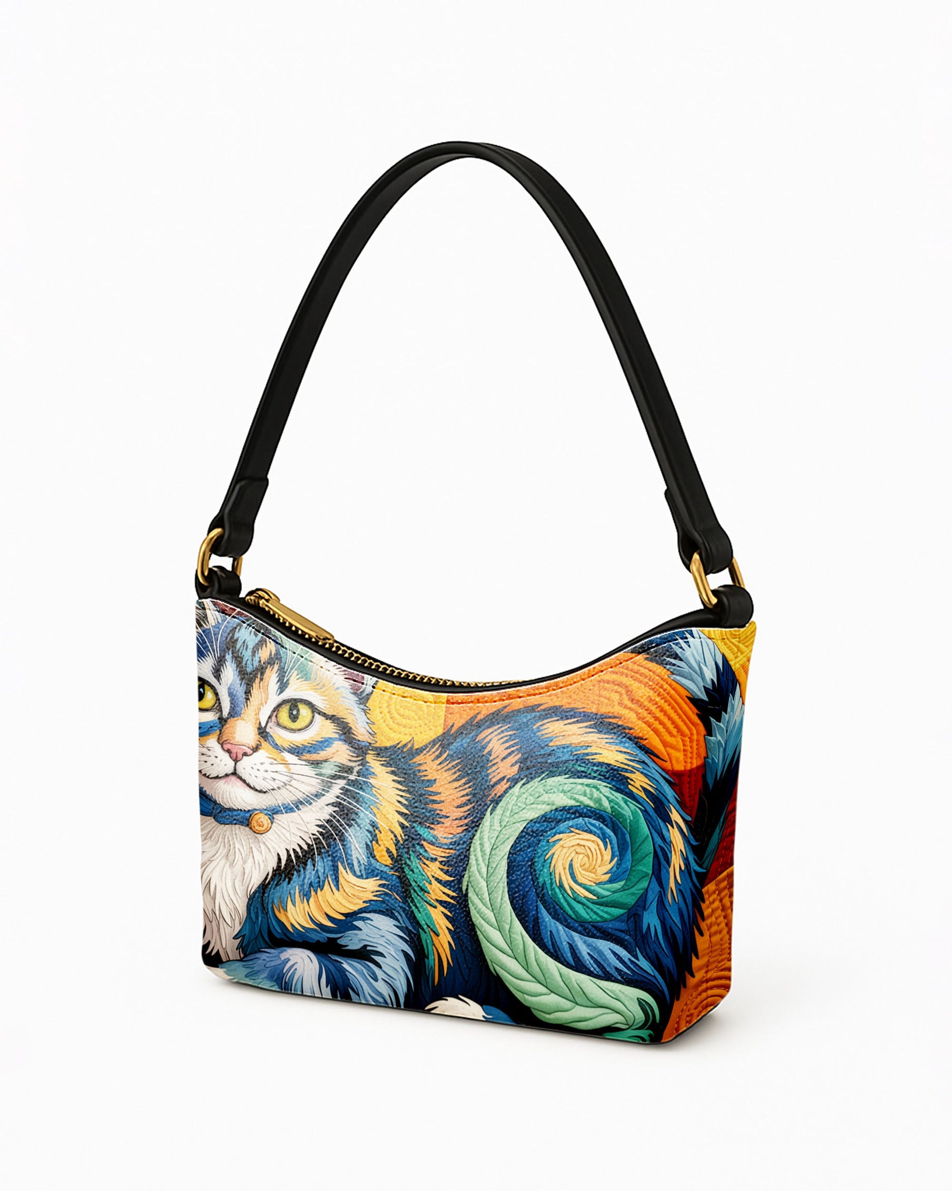 RE:LEATHER Leather Baguette Bag Underarm Shoulder Bag in Starry Night With Colorful Cat 04