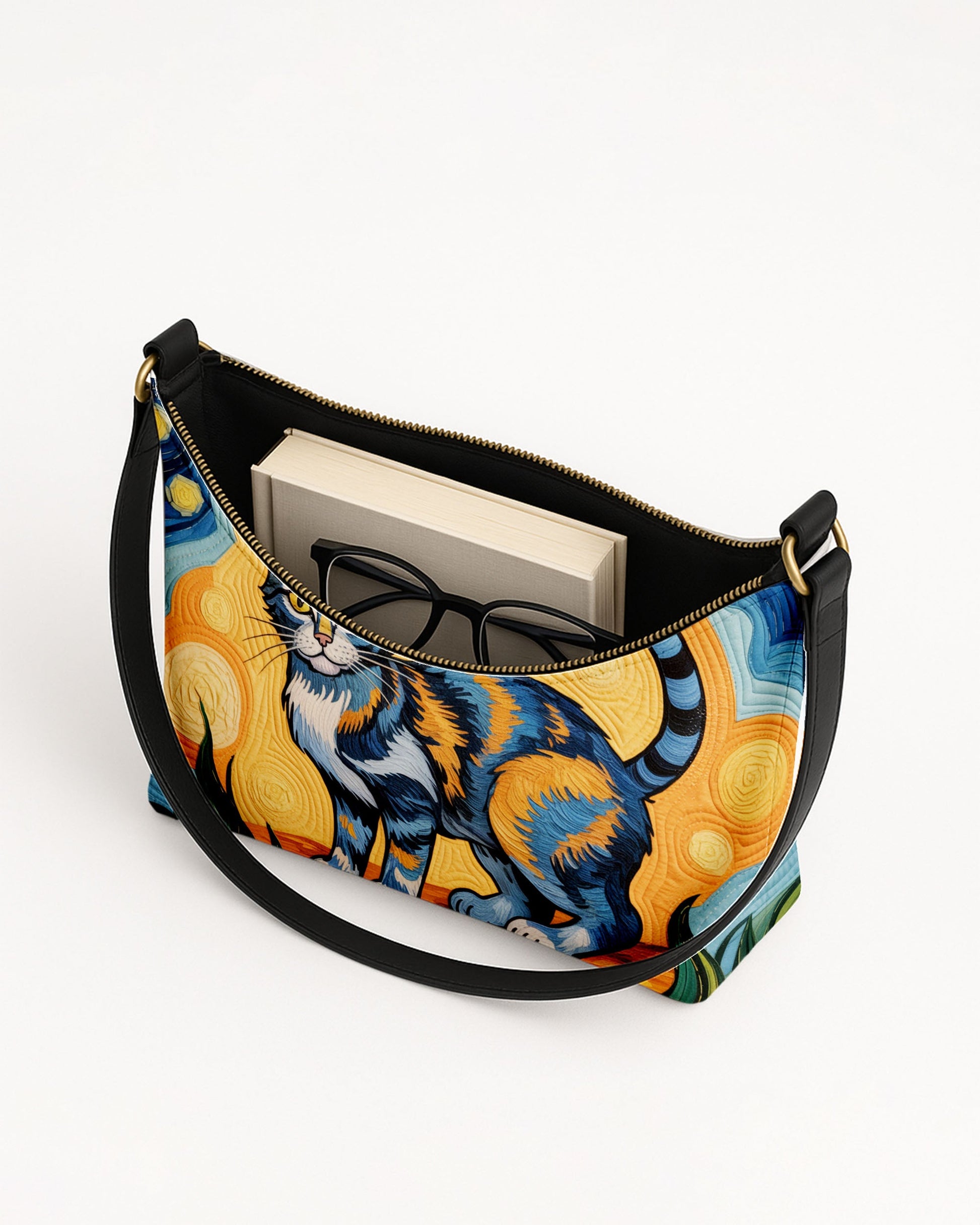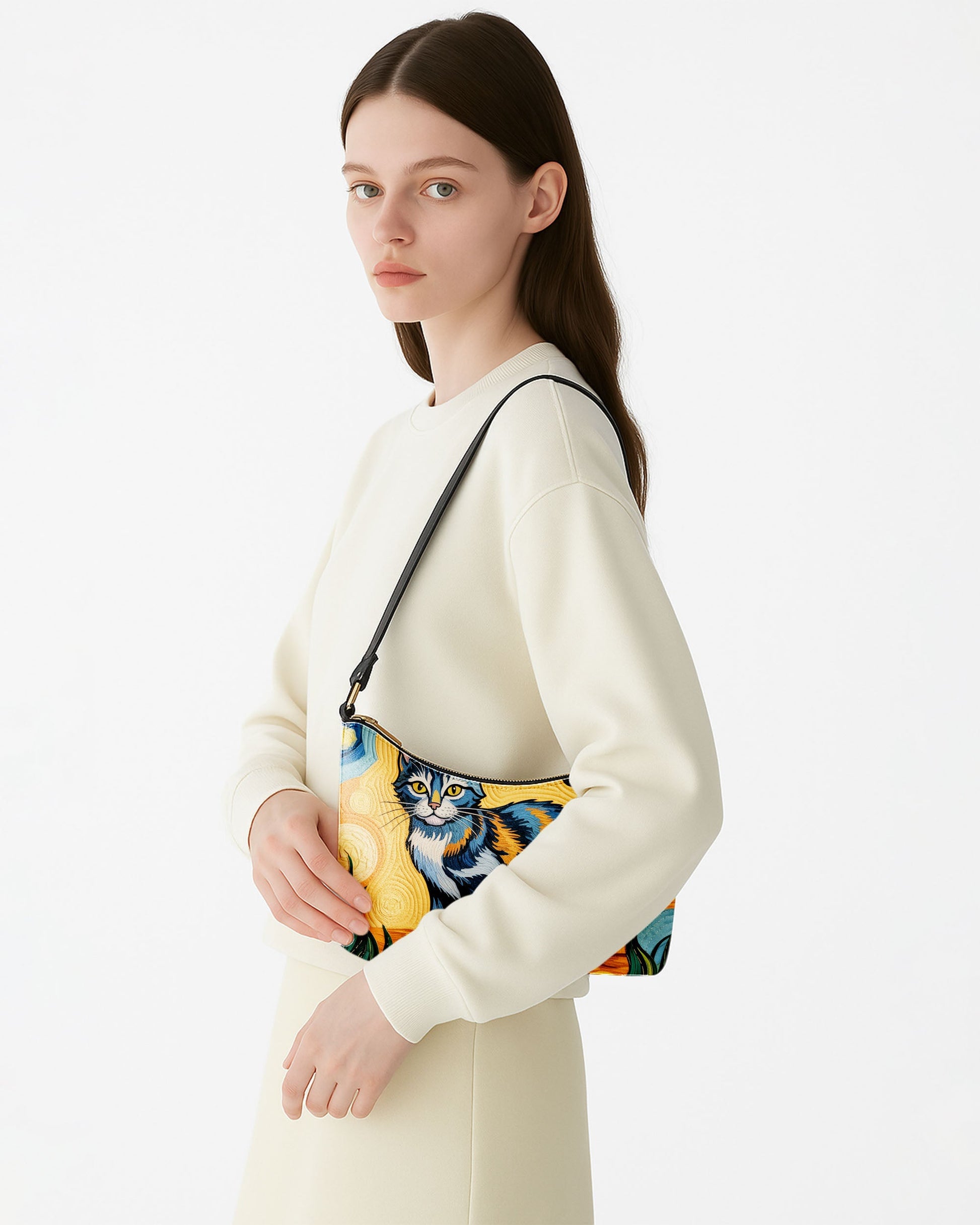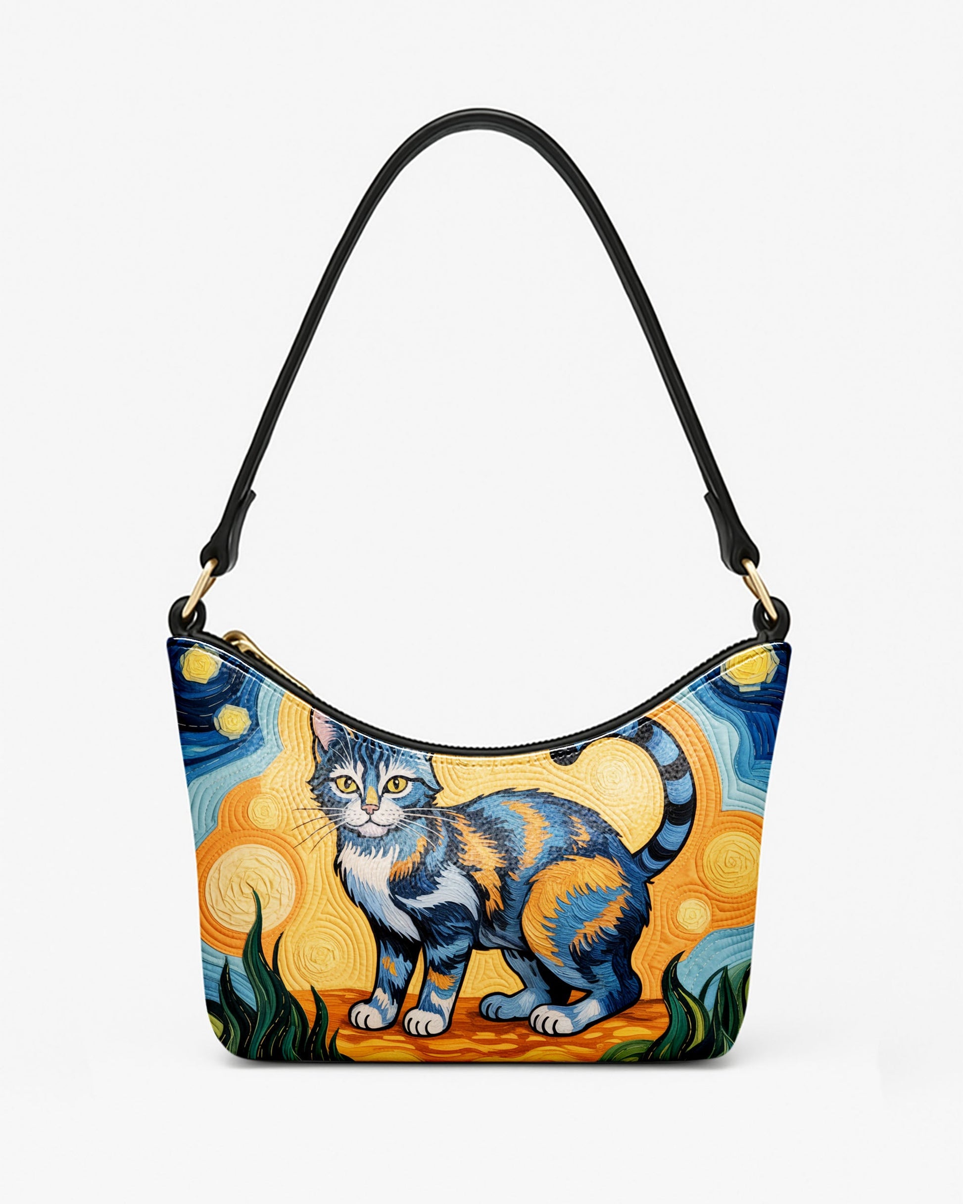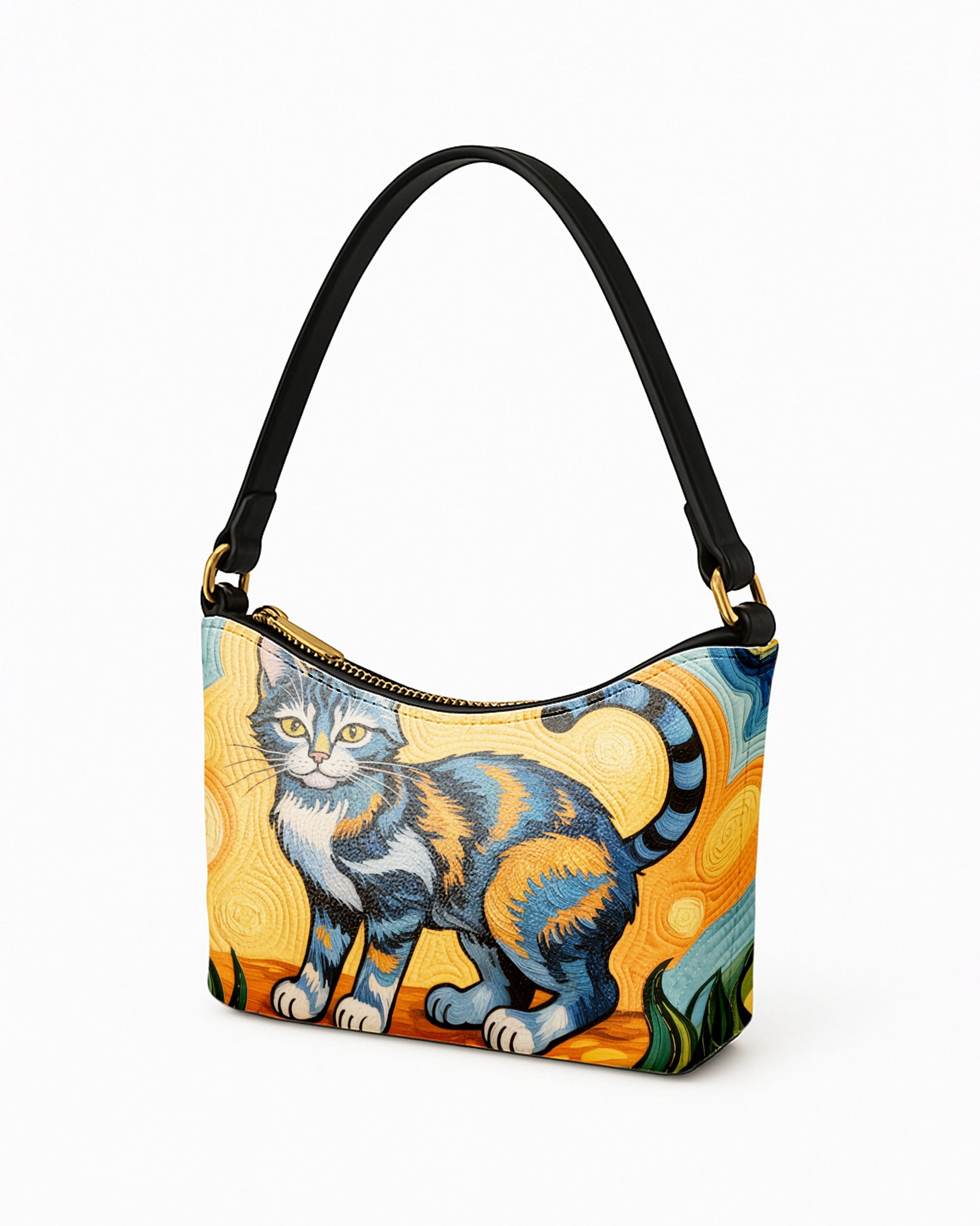 RE:LEATHER Leather Baguette Bag Underarm Shoulder Bag in Starry Night With Colorful Cat 06