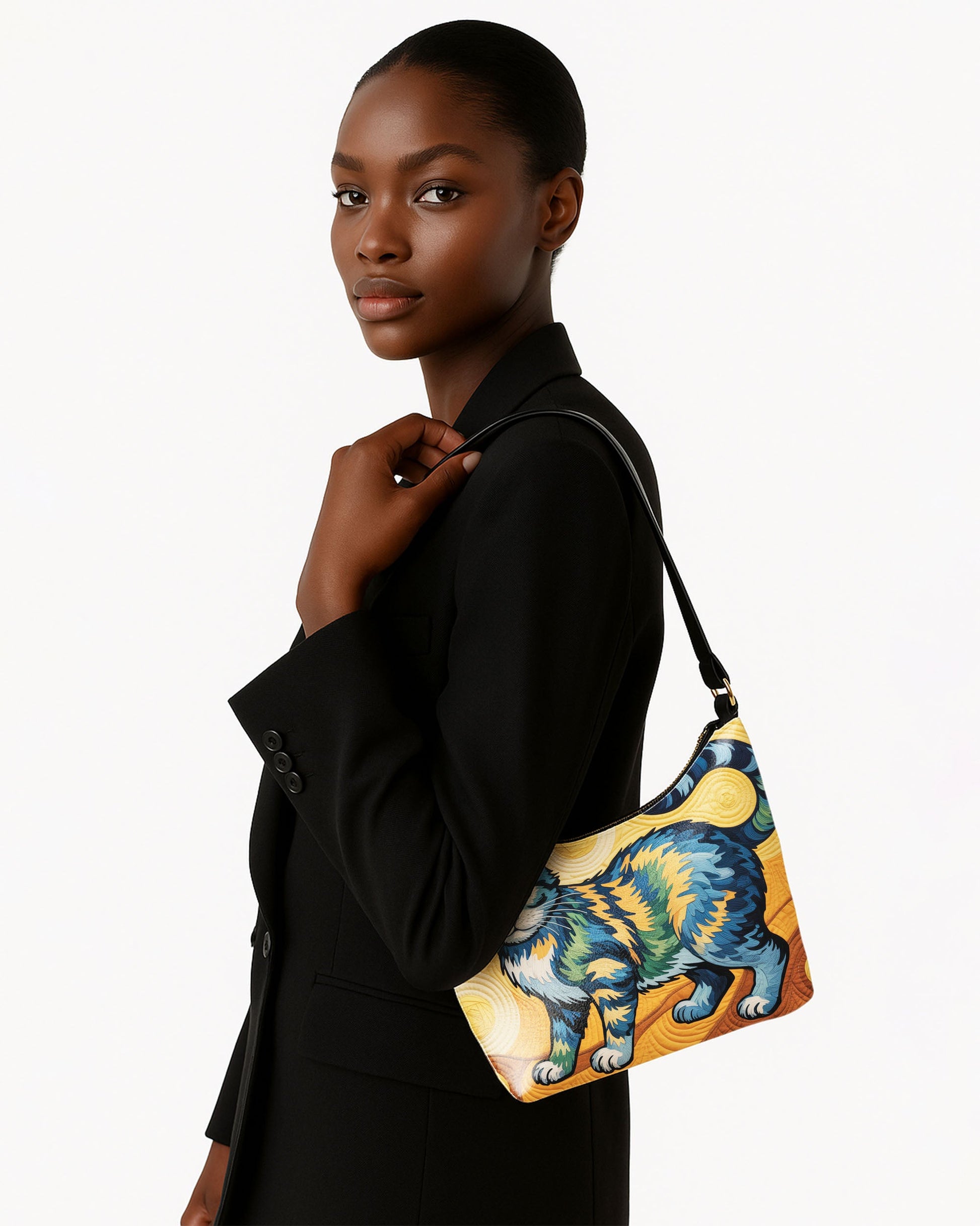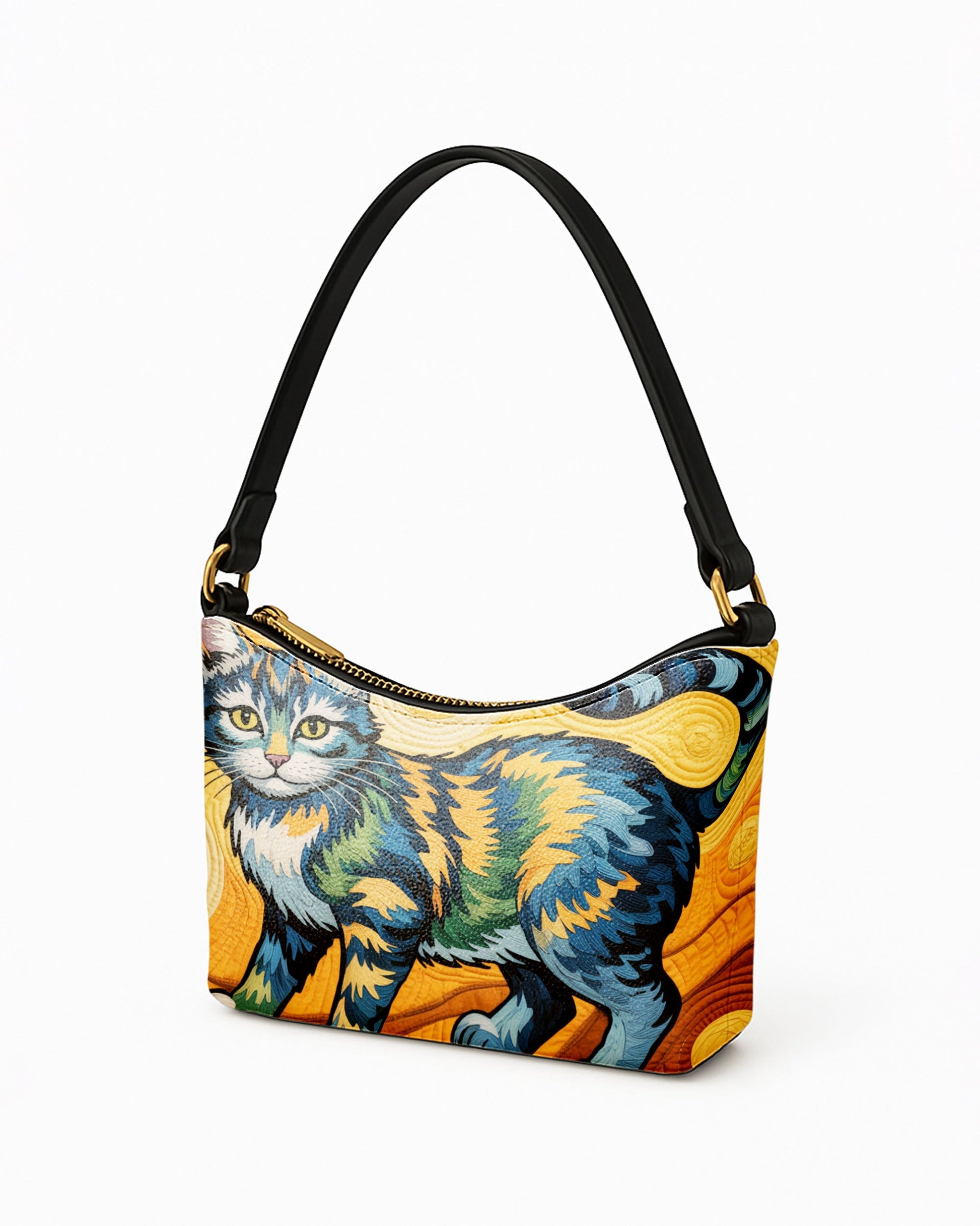 RE:LEATHER Leather Baguette Bag Underarm Shoulder Bag in Starry Night With Colorful Cat 08