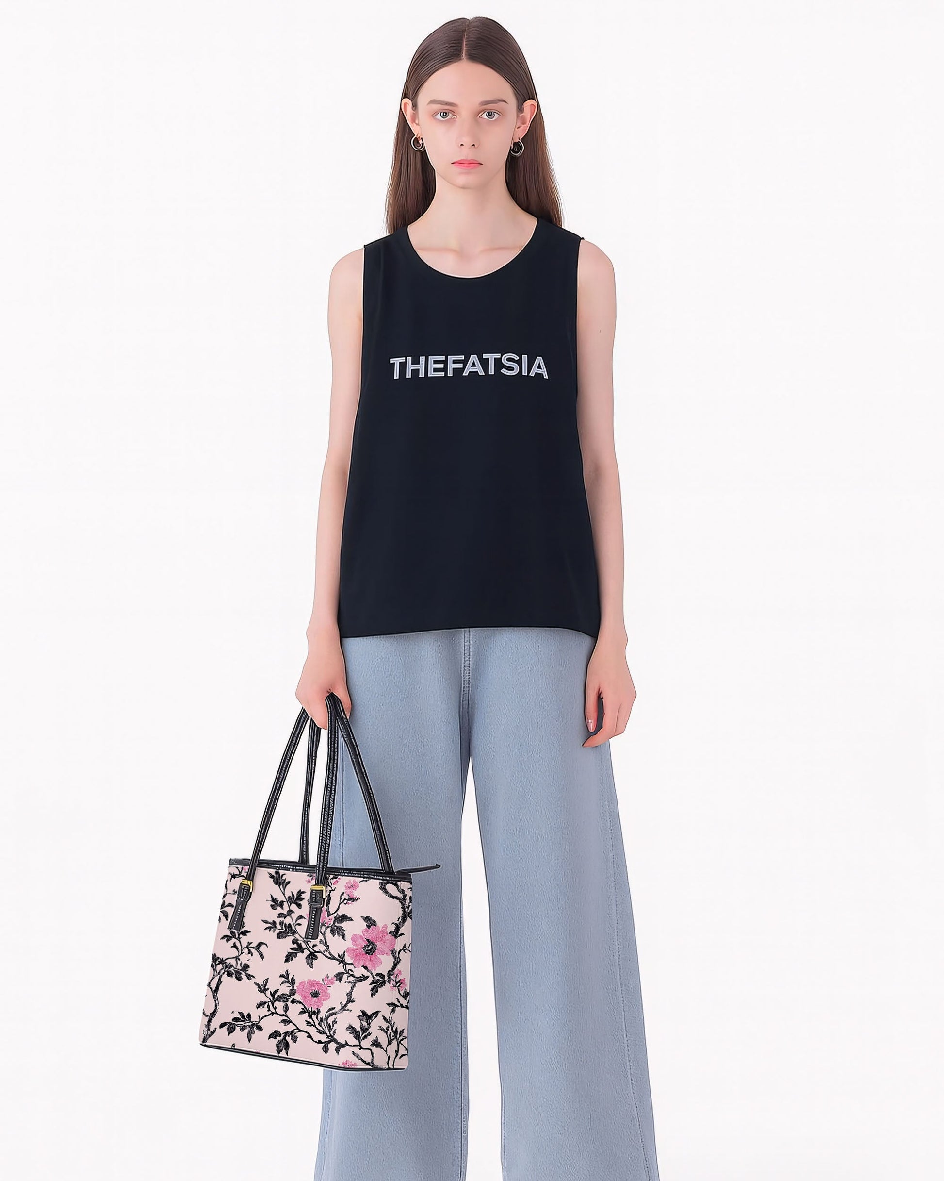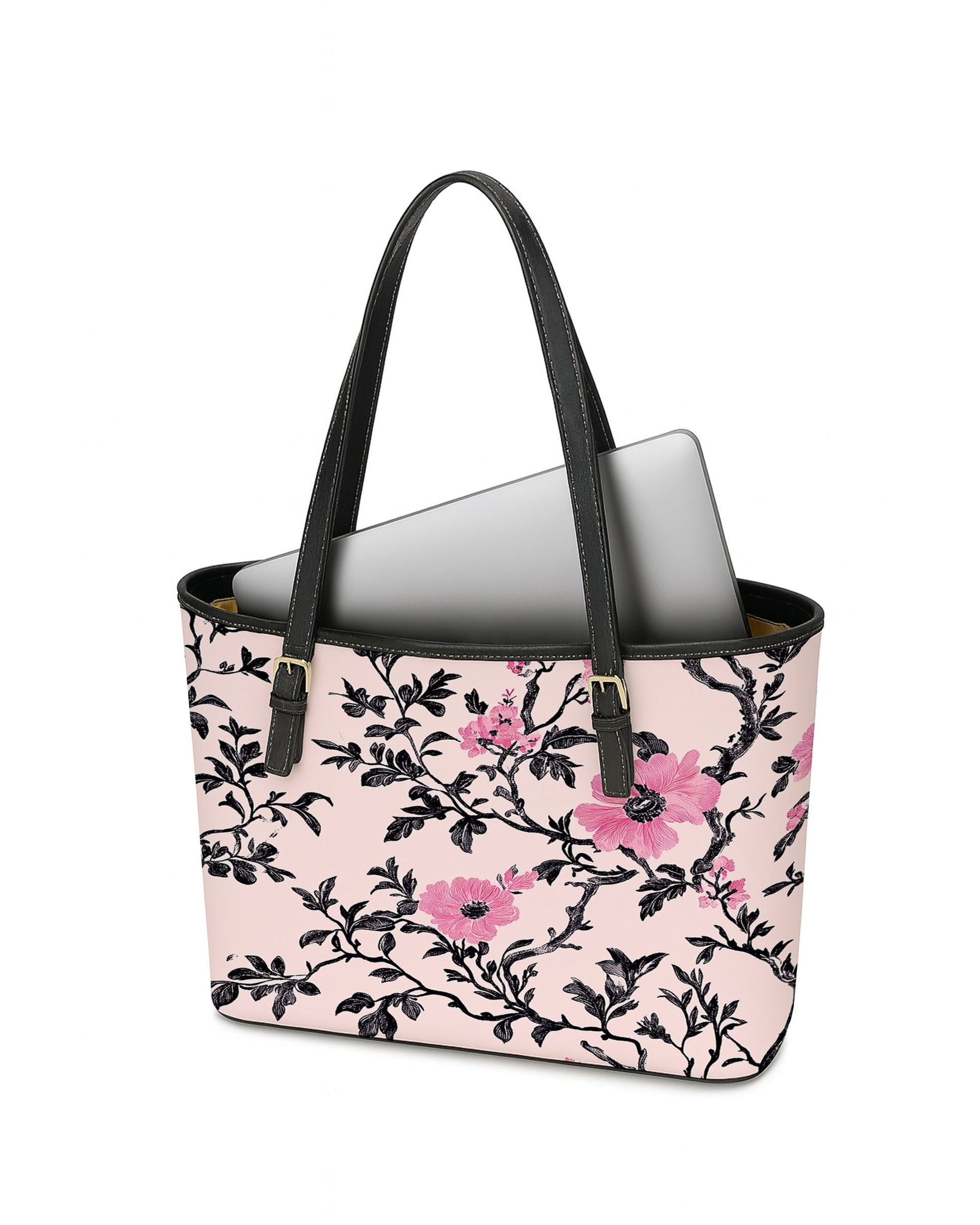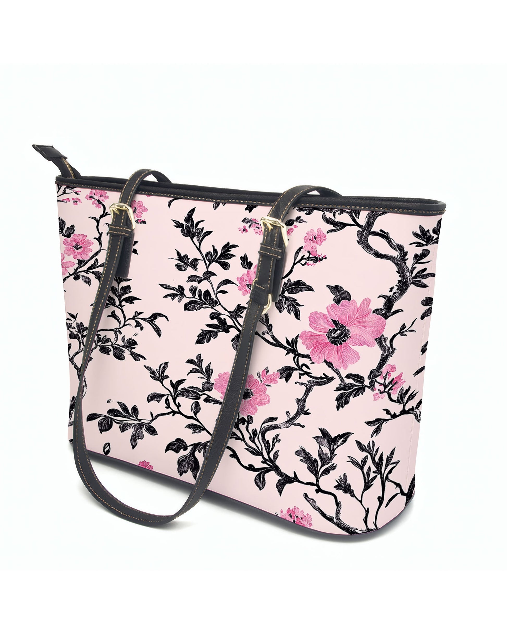 RE:LEATHER Leather Saddle Shoulder Bag with Top Handle Casual Tote Bag in Black and Pink Flower