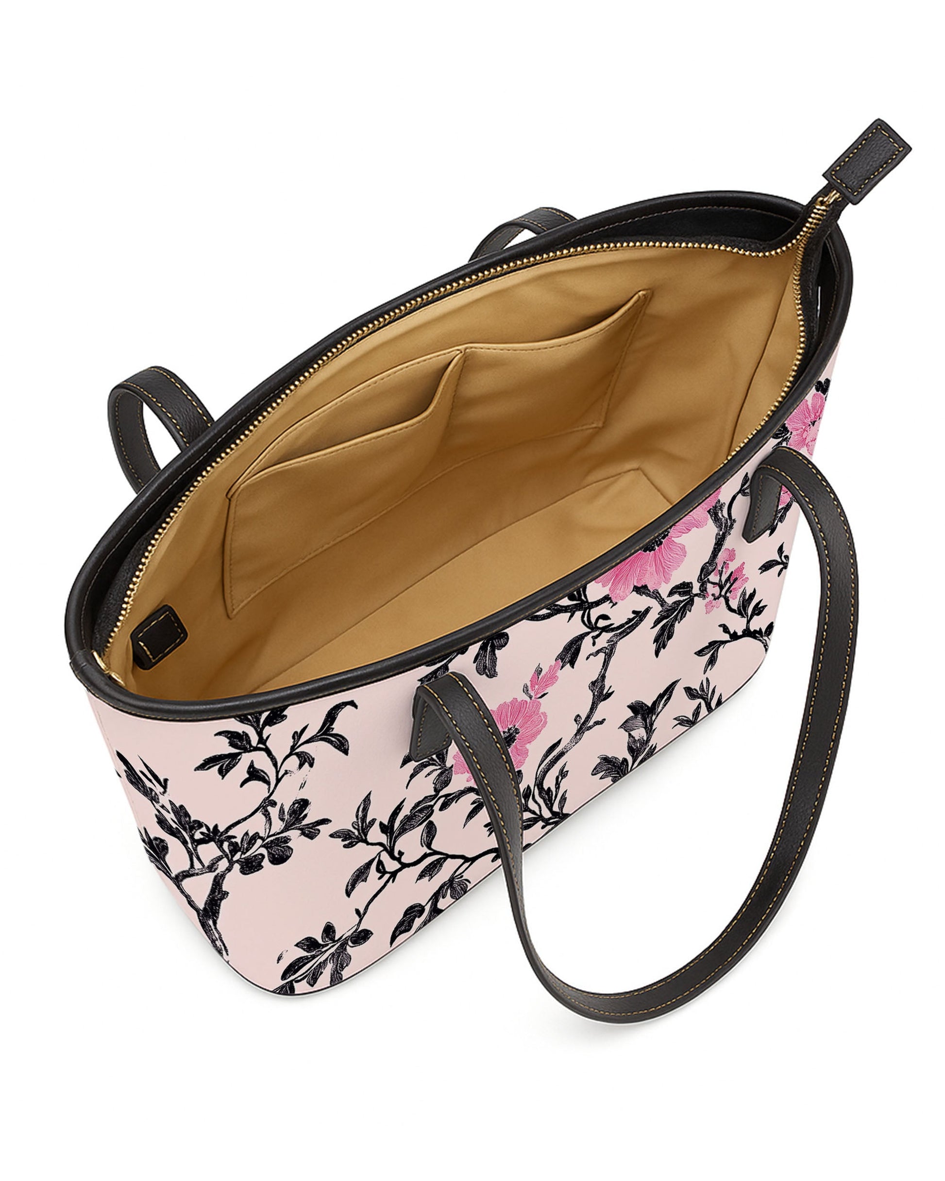 The bag is designed for daily convenience. A spacious, beige-lined interior features slip pockets and ample storage, ideal for organizing your essentials neatly. Secured by a smooth zipper closure, and complemented by adjustable black leather handles, it combines personalized flair with functional design—perfect for everyday outings, shopping trips, or work essentials.