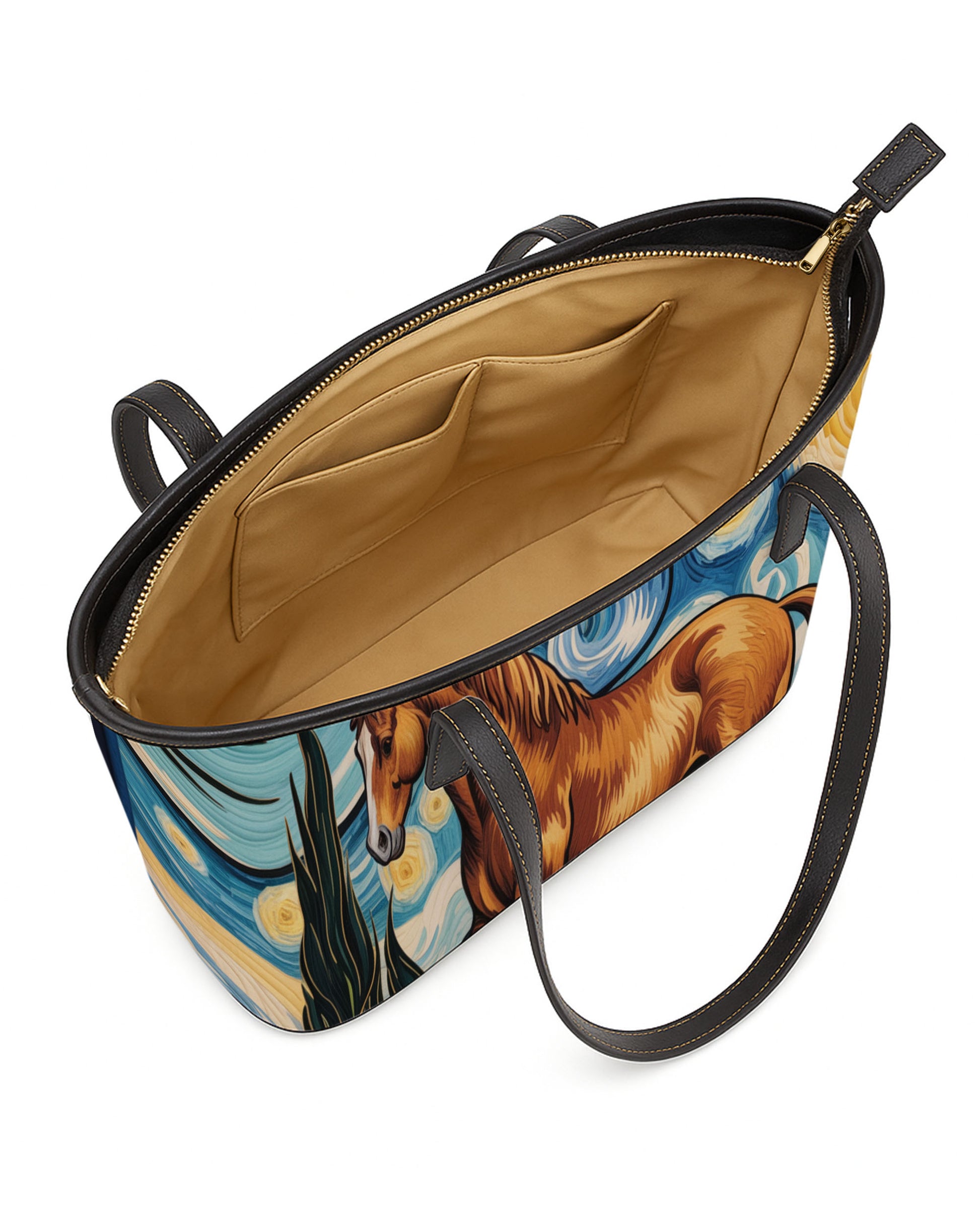 The bag is designed for daily convenience. A spacious, beige-lined interior features slip pockets and ample storage, ideal for organizing your essentials neatly. Secured by a smooth zipper closure, and complemented by adjustable black leather handles, it combines personalized flair with functional design—perfect for everyday outings, shopping trips, or work essentials.