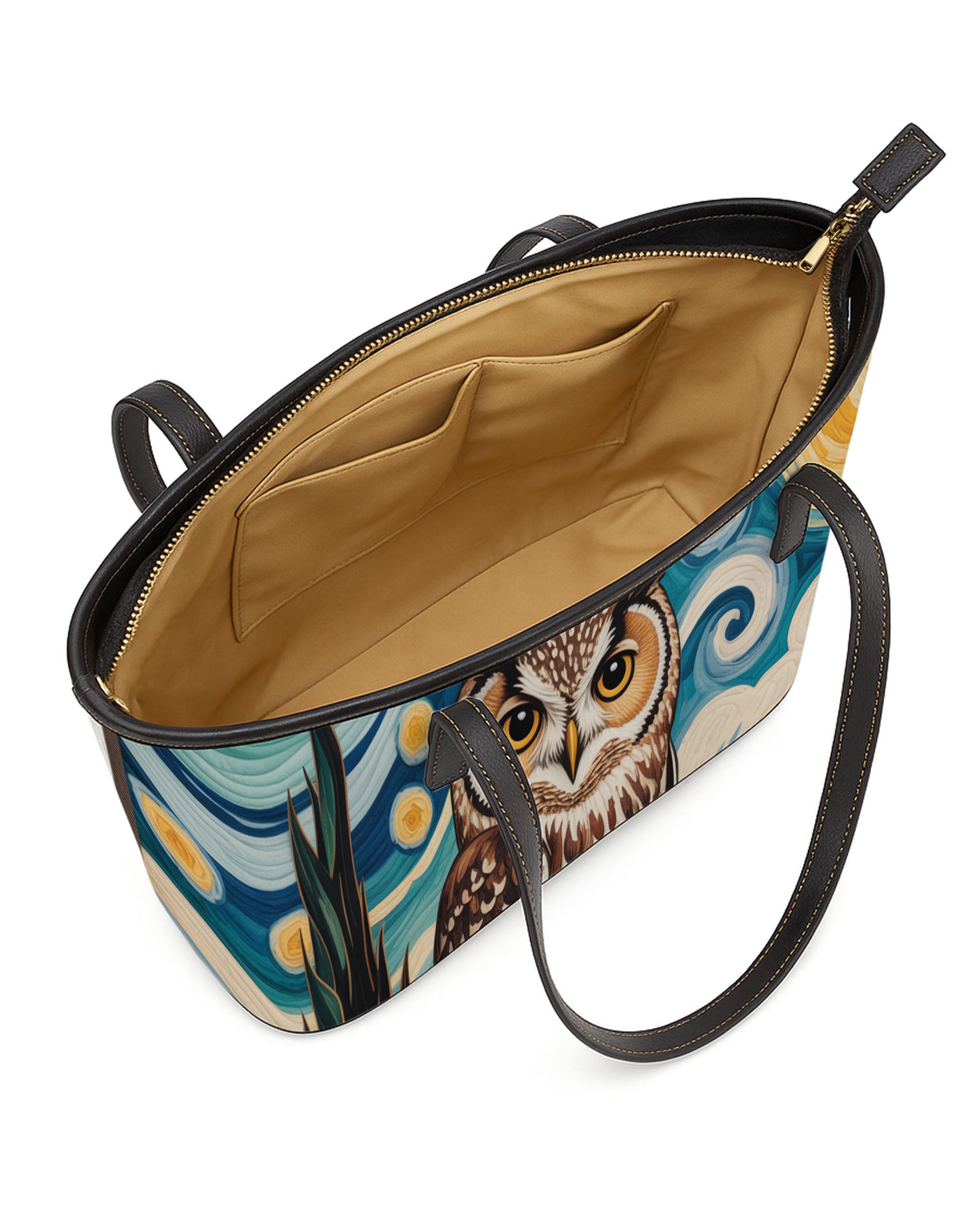 The bag is designed for daily convenience. A spacious, beige-lined interior features slip pockets and ample storage, ideal for organizing your essentials neatly. Secured by a smooth zipper closure, and complemented by adjustable black leather handles, it combines personalized flair with functional design—perfect for everyday outings, shopping trips, or work essentials.