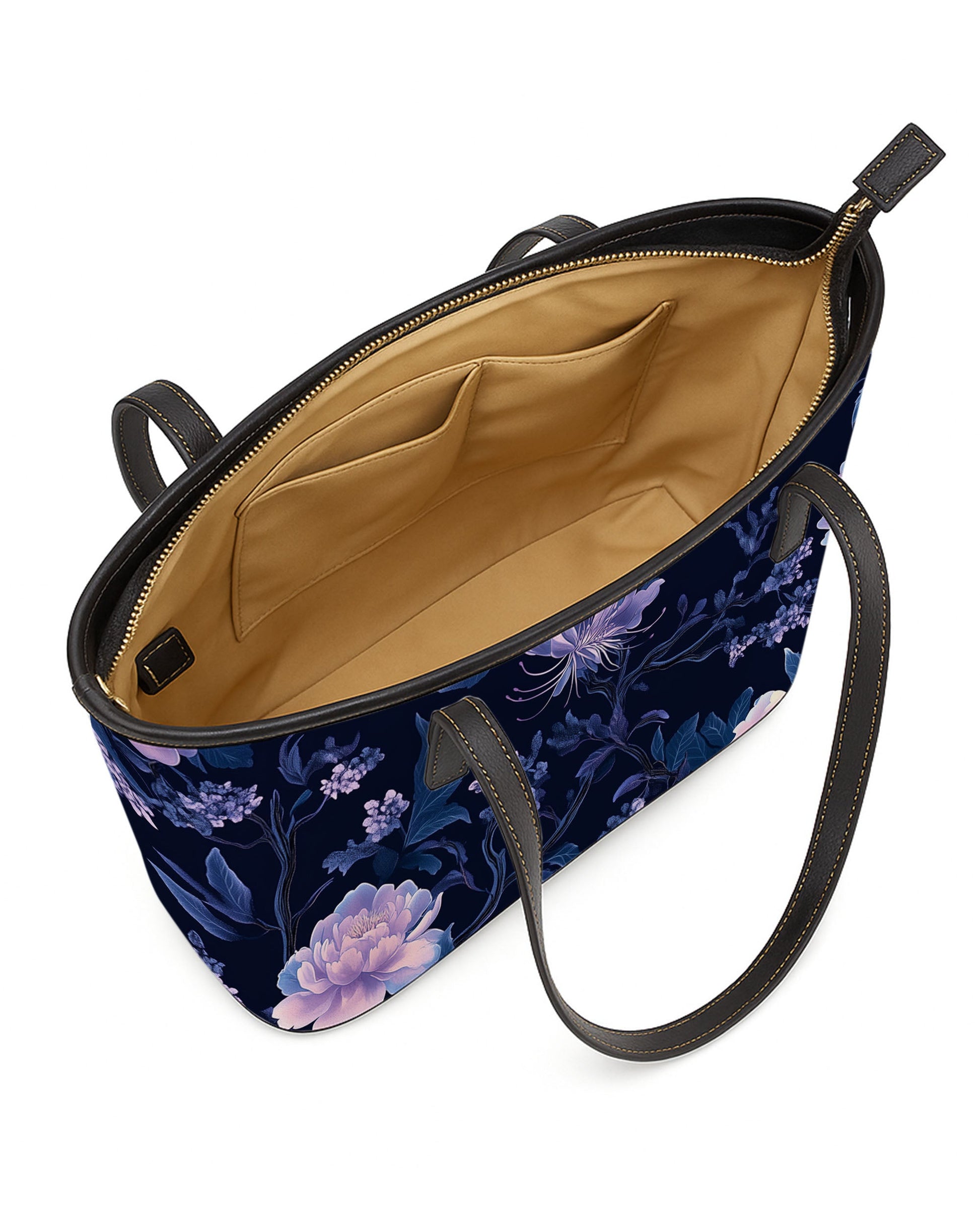 The bag is designed for daily convenience. A spacious, beige-lined interior features slip pockets and ample storage, ideal for organizing your essentials neatly. Secured by a smooth zipper closure, and complemented by adjustable black leather handles, it combines personalized flair with functional design—perfect for everyday outings, shopping trips, or work essentials.