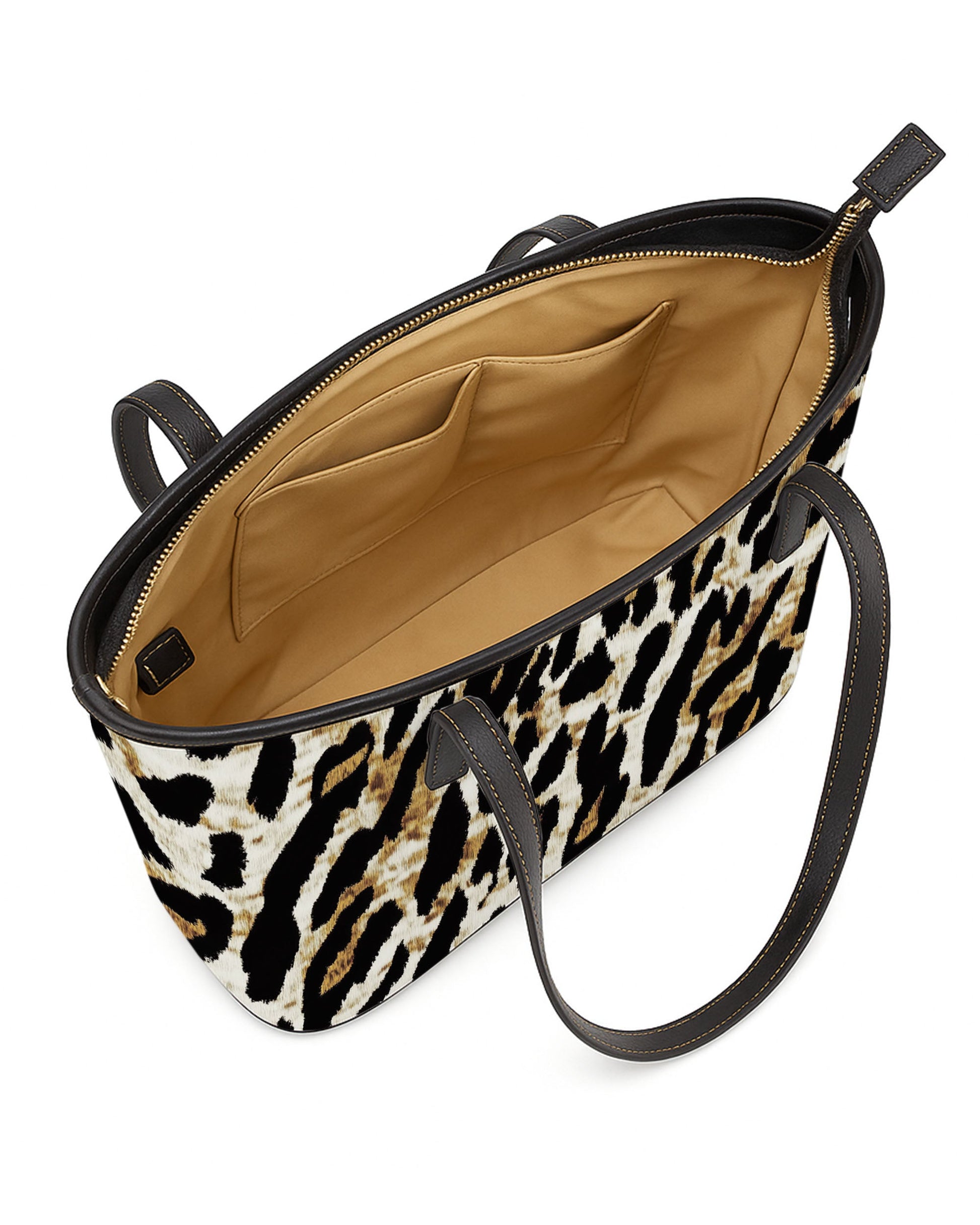 The bag is designed for daily convenience. A spacious, beige-lined interior features slip pockets and ample storage, ideal for organizing your essentials neatly. Secured by a smooth zipper closure, and complemented by adjustable black leather handles, it combines personalized flair with functional design—perfect for everyday outings, shopping trips, or work essentials.