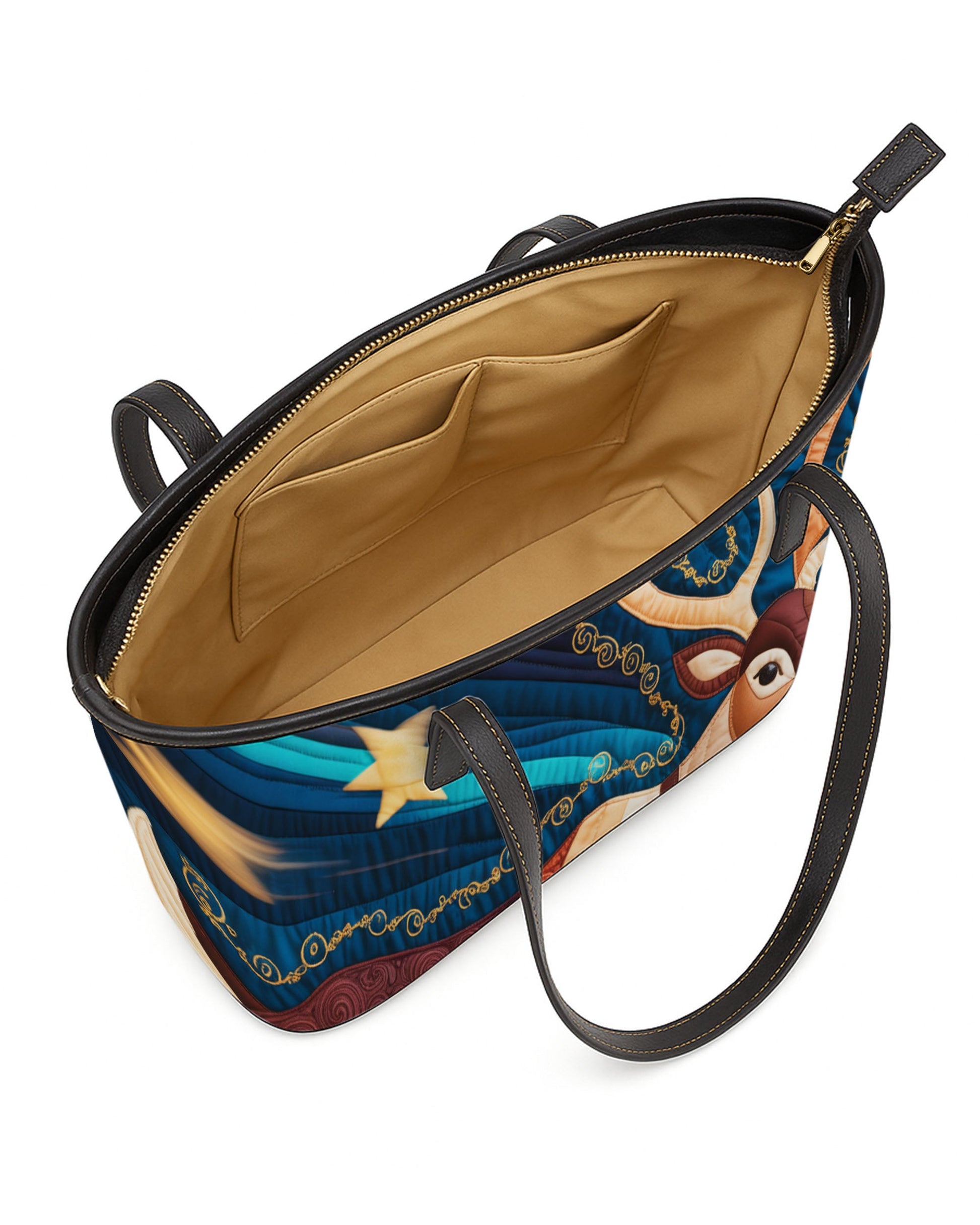 The bag is designed for daily convenience. A spacious, beige-lined interior features slip pockets and ample storage, ideal for organizing your essentials neatly. Secured by a smooth zipper closure, and complemented by adjustable black leather handles, it combines personalized flair with functional design—perfect for everyday outings, shopping trips, or work essentials.