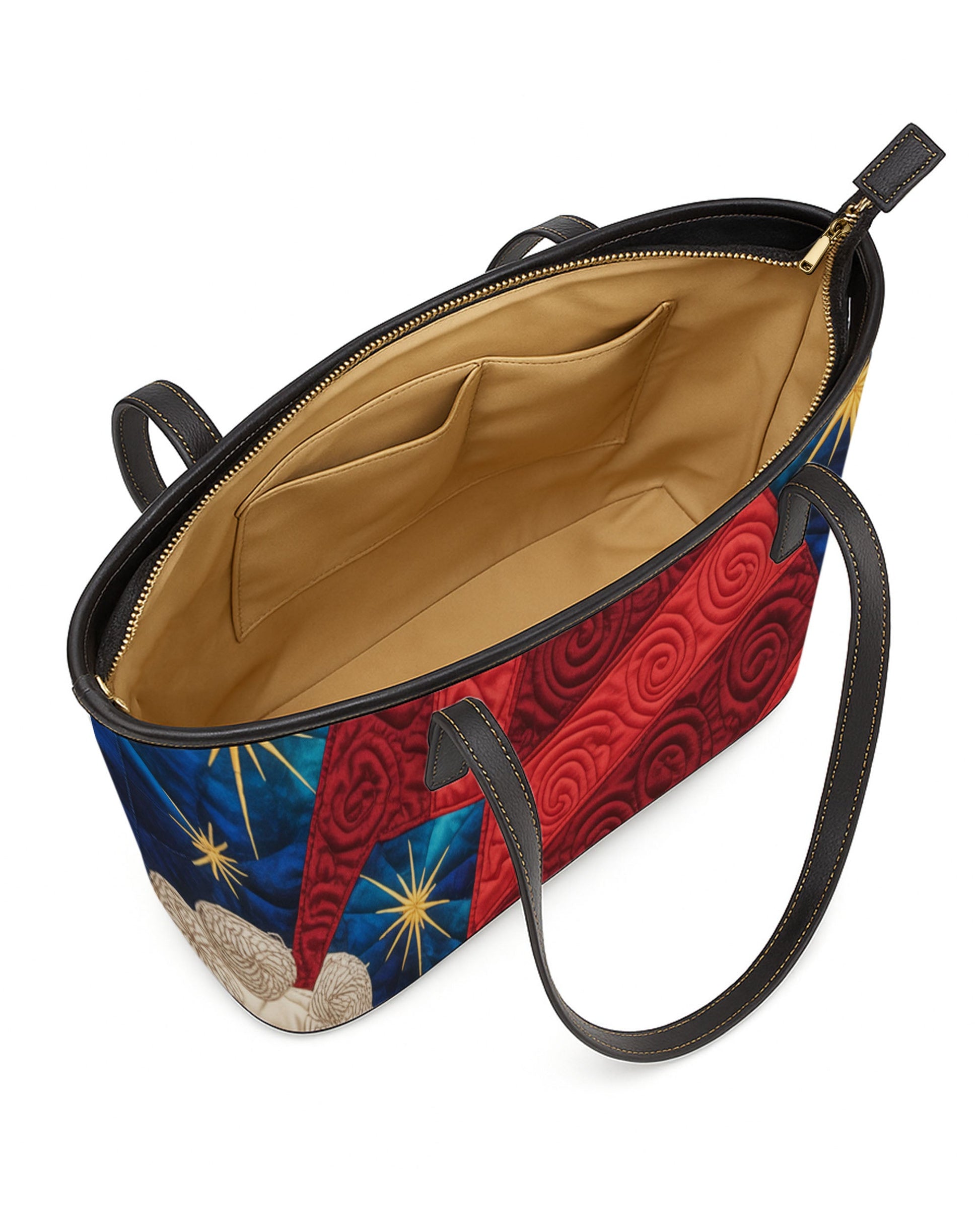 The bag is designed for daily convenience. A spacious, beige-lined interior features slip pockets and ample storage, ideal for organizing your essentials neatly. Secured by a smooth zipper closure, and complemented by adjustable black leather handles, it combines personalized flair with functional design—perfect for everyday outings, shopping trips, or work essentials.