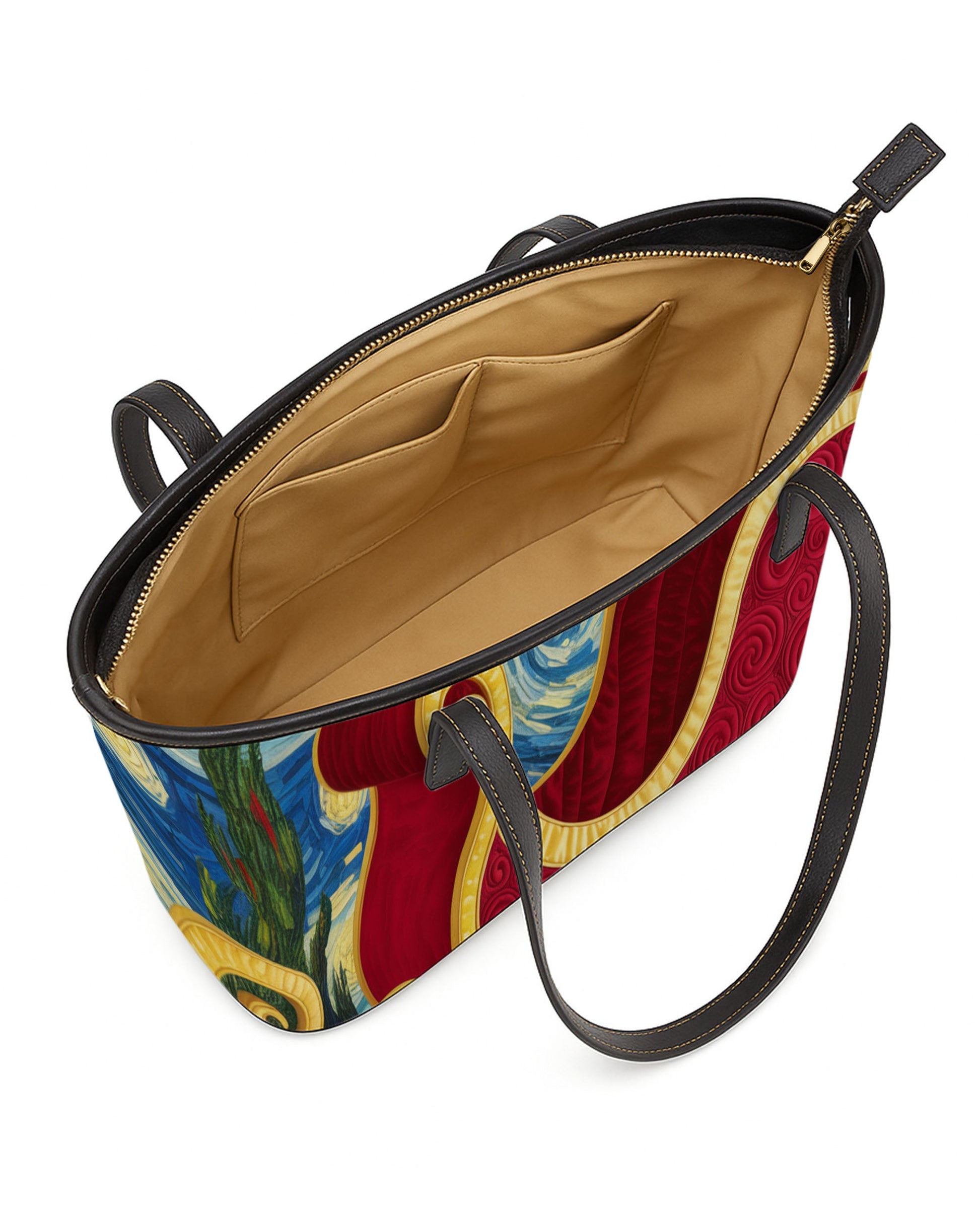 The bag is designed for daily convenience. A spacious, beige-lined interior features slip pockets and ample storage, ideal for organizing your essentials neatly. Secured by a smooth zipper closure, and complemented by adjustable black leather handles, it combines personalized flair with functional design—perfect for everyday outings, shopping trips, or work essentials.