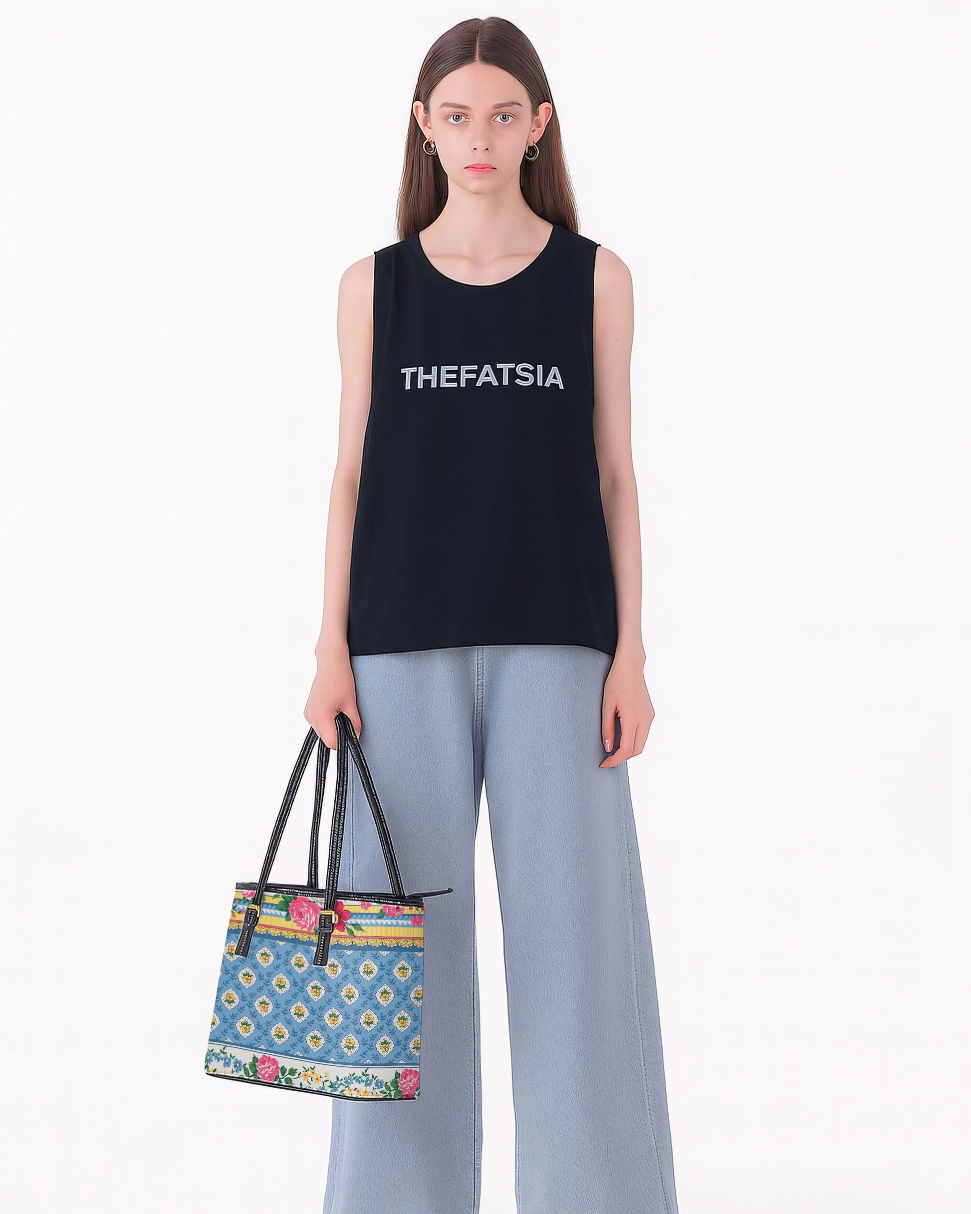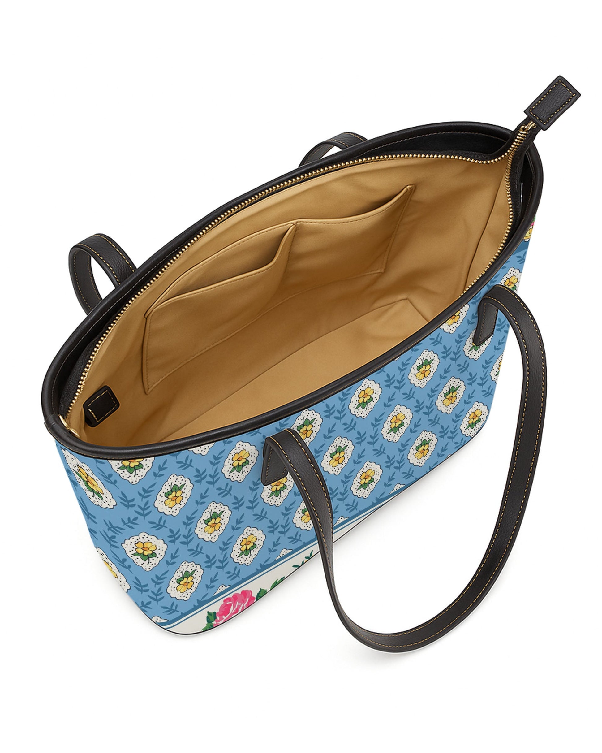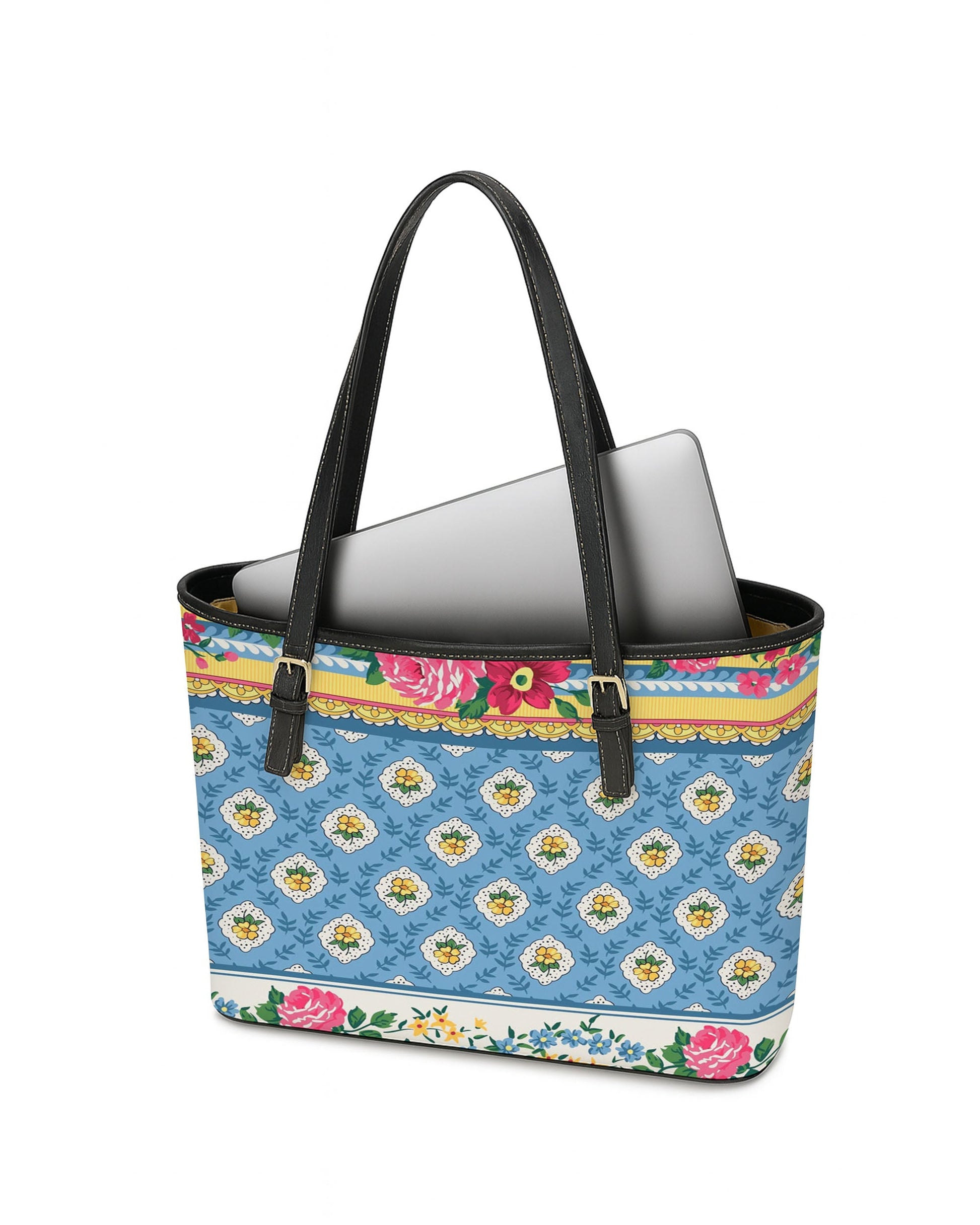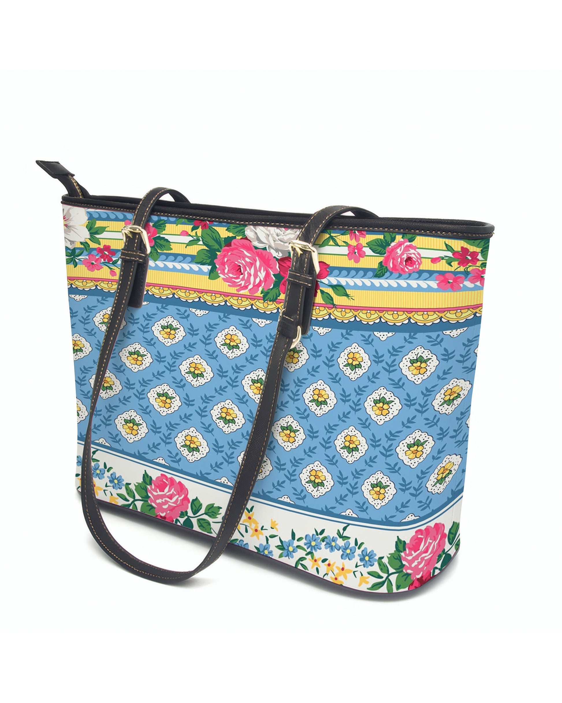 RE:LEATHER Leather Saddle Shoulder Bag with Top Handle Casual Tote Bag in Tiny Flower Yellow on Blue