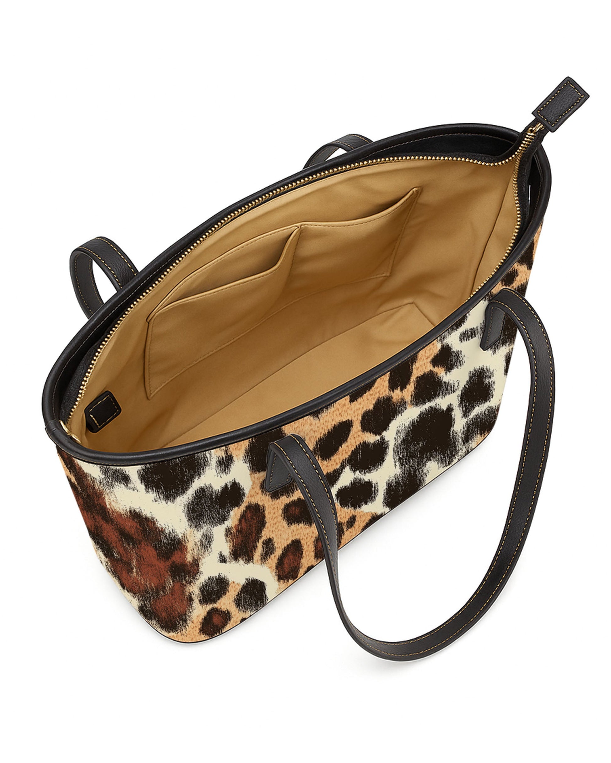 The bag is designed for daily convenience. A spacious, beige-lined interior features slip pockets and ample storage, ideal for organizing your essentials neatly. Secured by a smooth zipper closure, and complemented by adjustable black leather handles, it combines personalized flair with functional design—perfect for everyday outings, shopping trips, or work essentials.