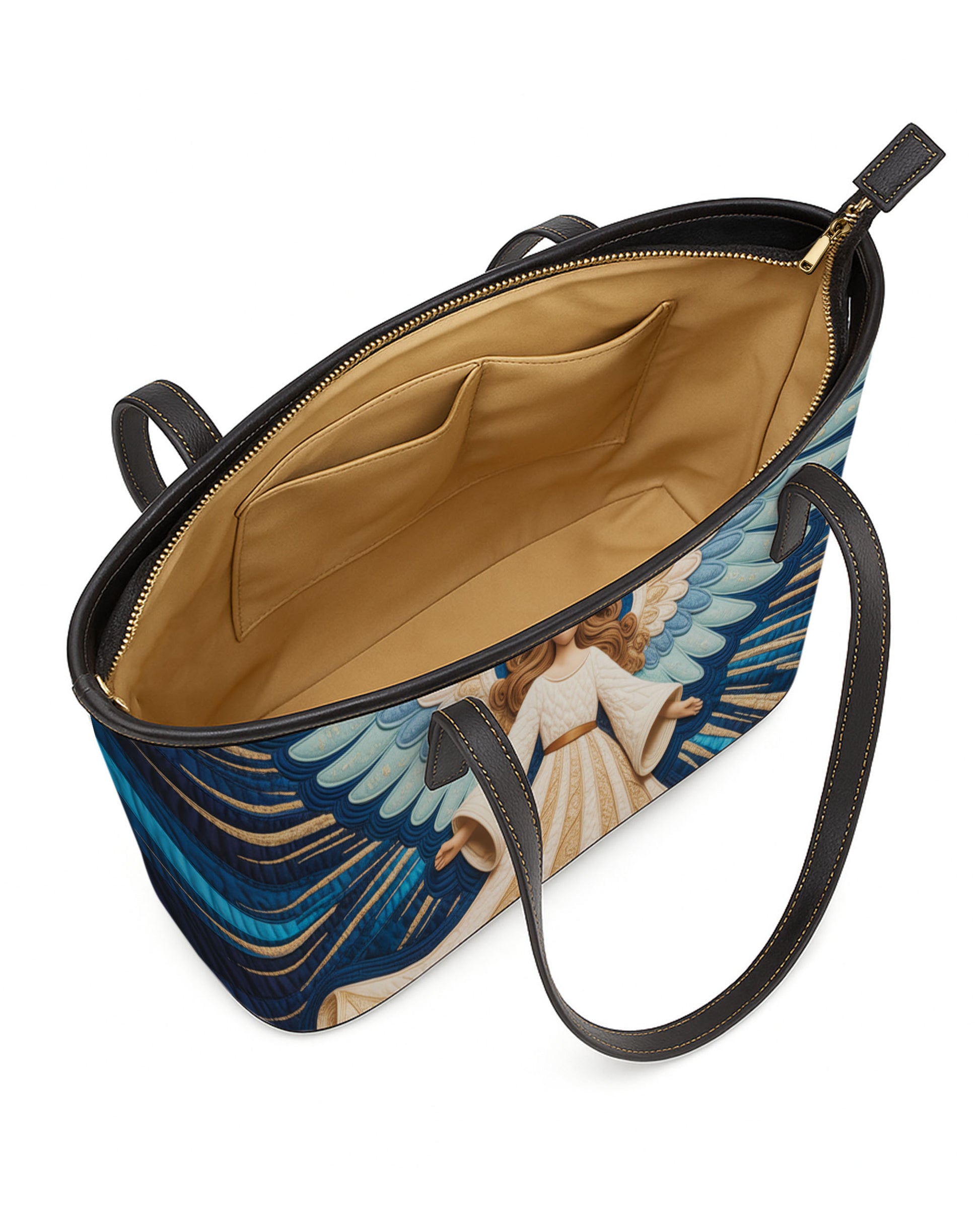 The bag is designed for daily convenience. A spacious, beige-lined interior features slip pockets and ample storage, ideal for organizing your essentials neatly. Secured by a smooth zipper closure, and complemented by adjustable black leather handles, it combines personalized flair with functional design—perfect for everyday outings, shopping trips, or work essentials.