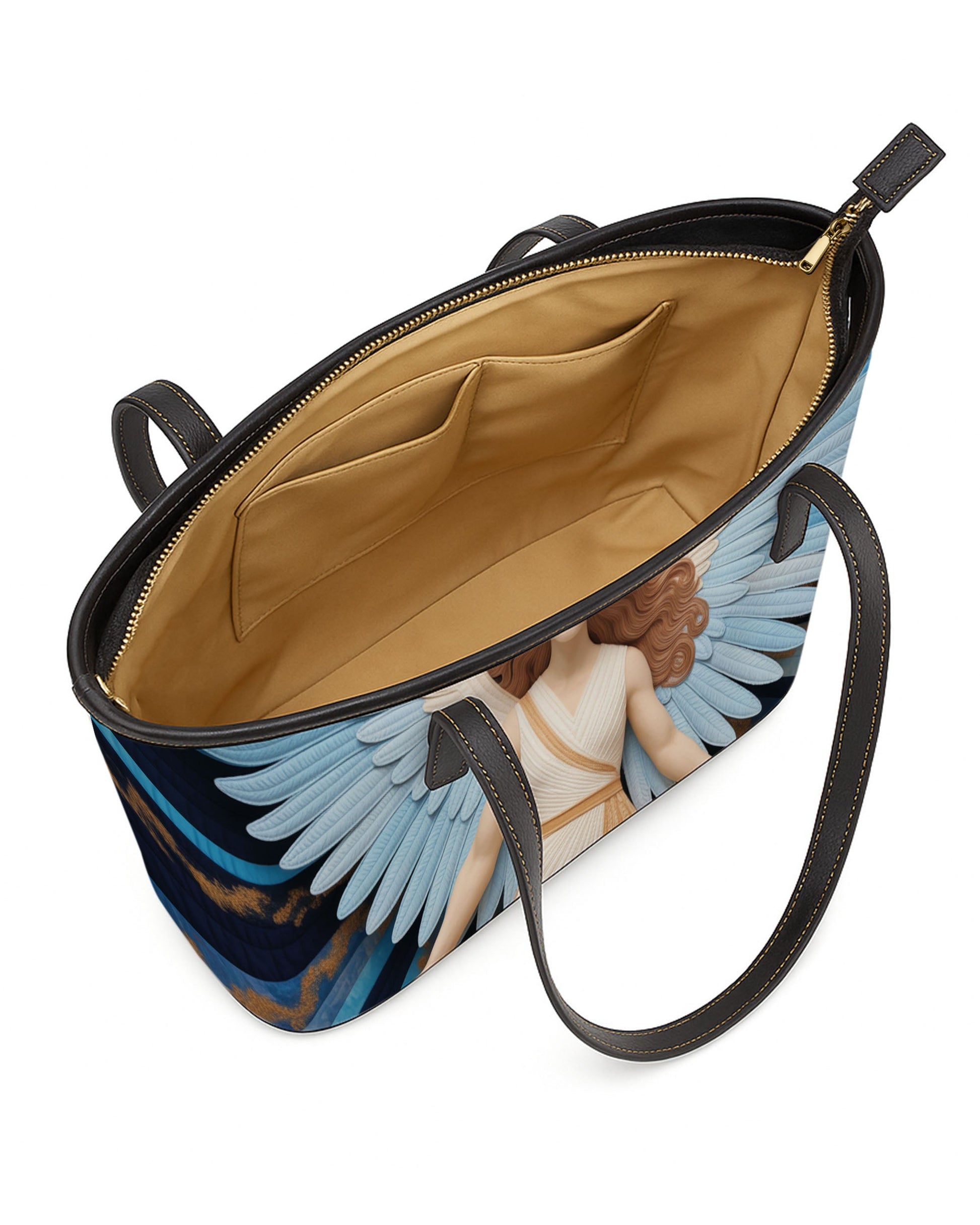 The bag is designed for daily convenience. A spacious, beige-lined interior features slip pockets and ample storage, ideal for organizing your essentials neatly. Secured by a smooth zipper closure, and complemented by adjustable black leather handles, it combines personalized flair with functional design—perfect for everyday outings, shopping trips, or work essentials.