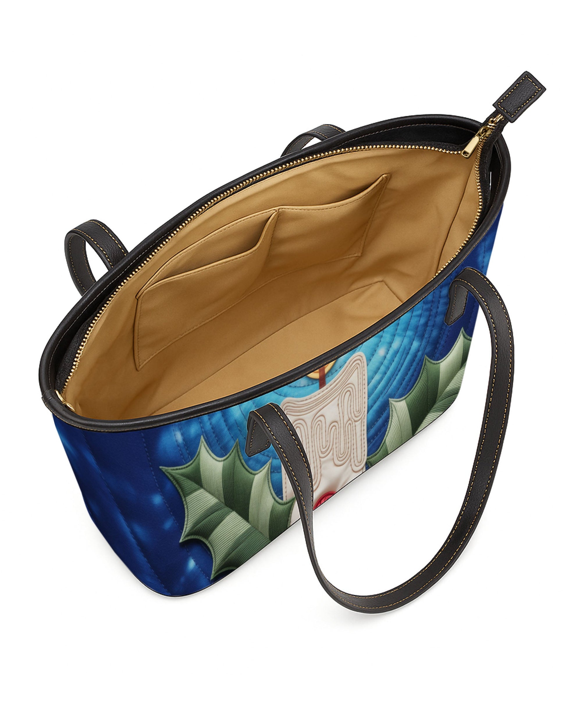 The bag is designed for daily convenience. A spacious, beige-lined interior features slip pockets and ample storage, ideal for organizing your essentials neatly. Secured by a smooth zipper closure, and complemented by adjustable black leather handles, it combines personalized flair with functional design—perfect for everyday outings, shopping trips, or work essentials.