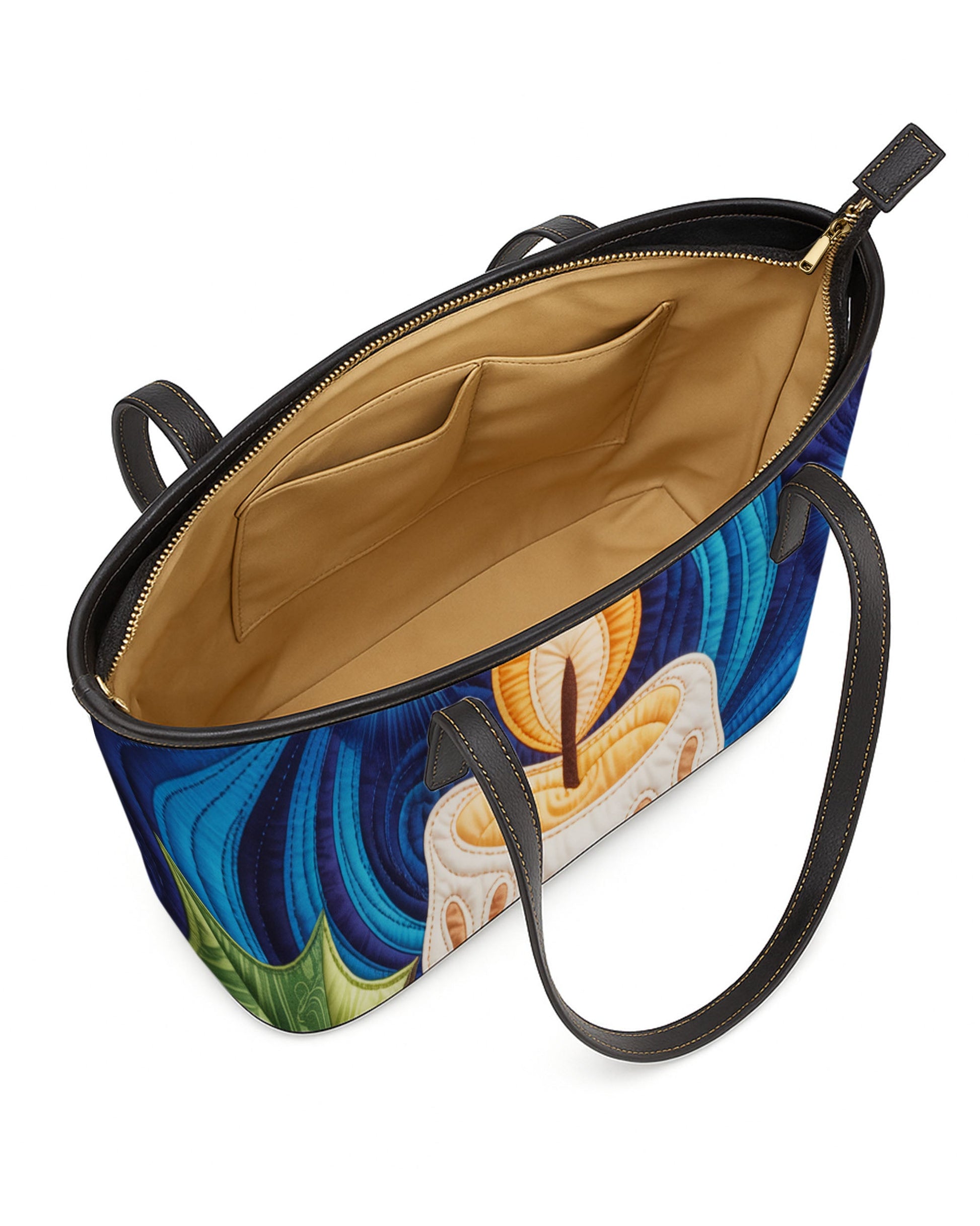 The bag is designed for daily convenience. A spacious, beige-lined interior features slip pockets and ample storage, ideal for organizing your essentials neatly. Secured by a smooth zipper closure, and complemented by adjustable black leather handles, it combines personalized flair with functional design—perfect for everyday outings, shopping trips, or work essentials.
