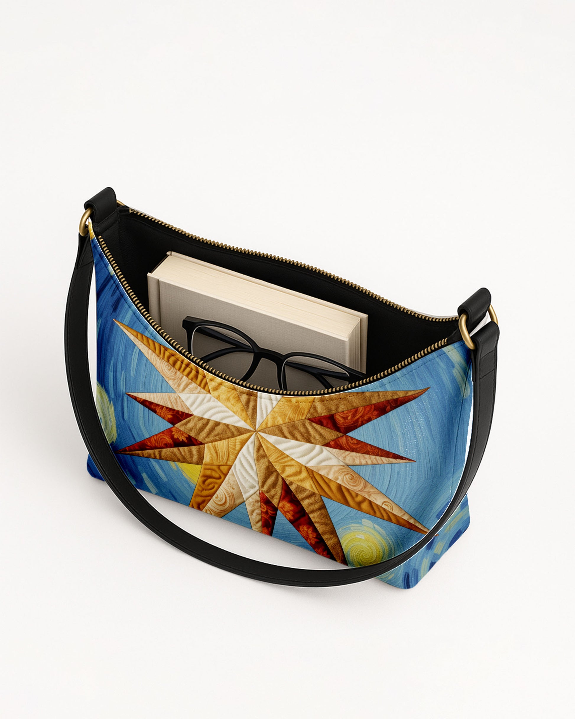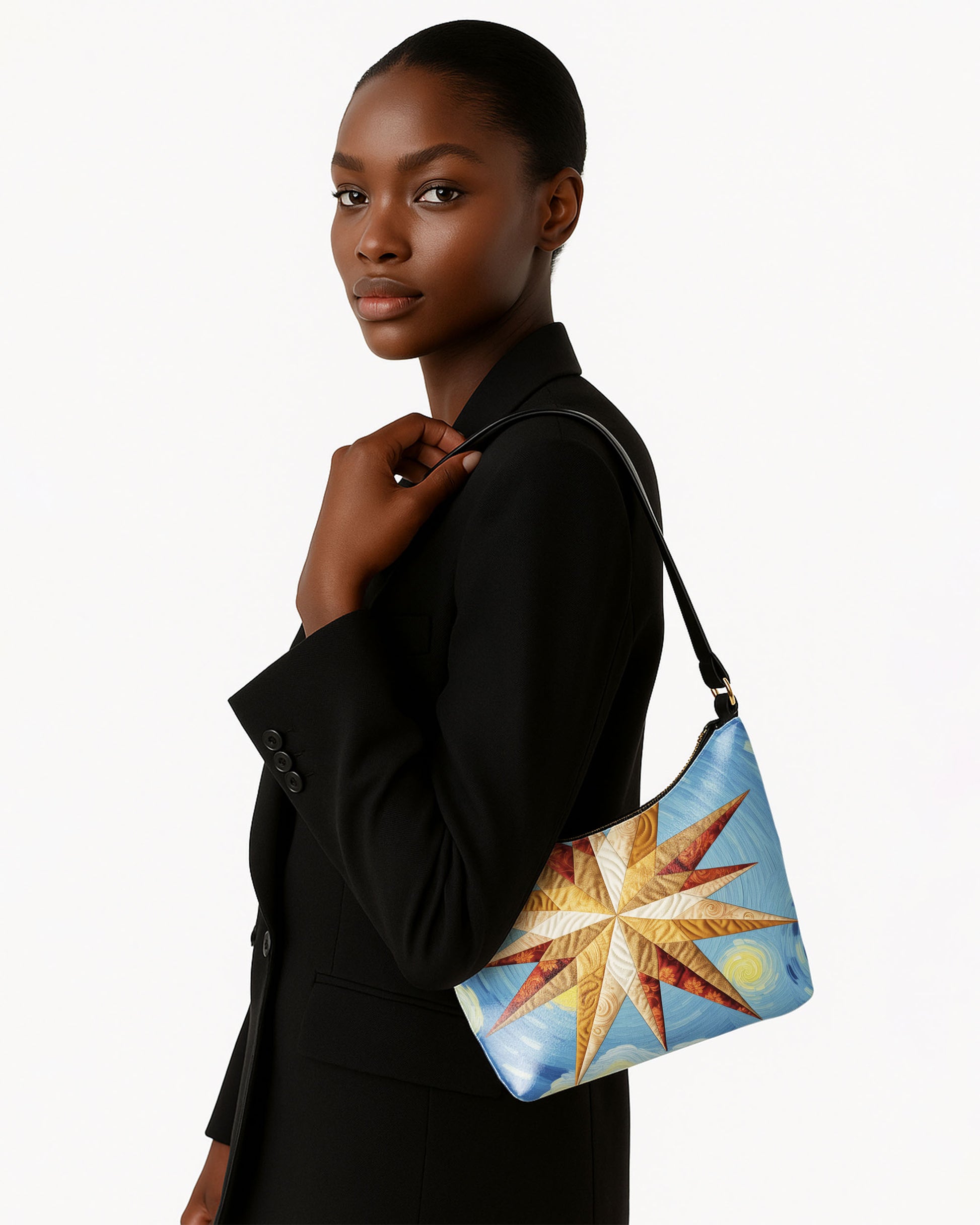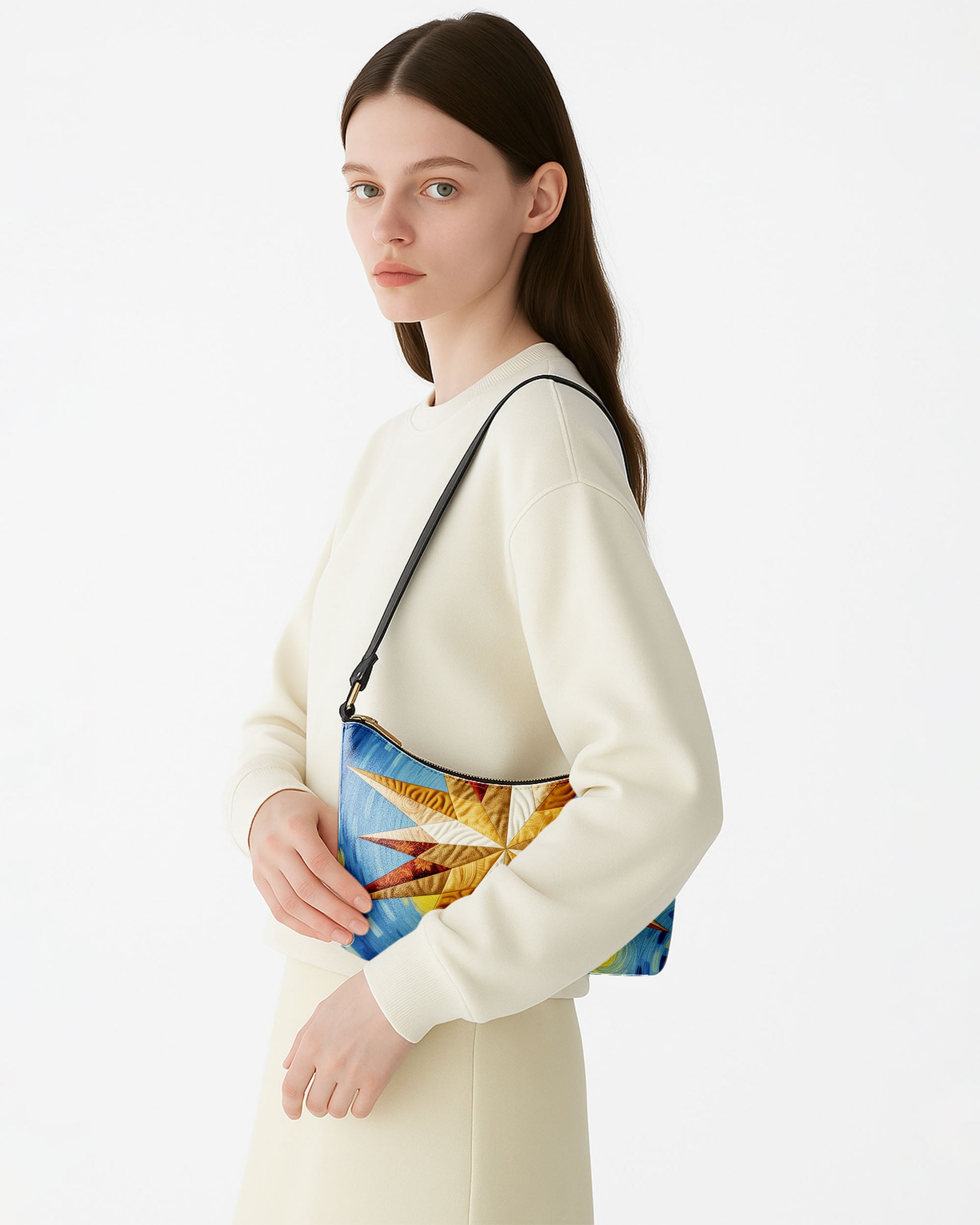 DETAILS This art-inspired shoulder bag offers a spacious, beige-lined interior secured with a smooth zipper closure. Finished with a sleek black leather strap, it’s the perfect blend of creativity and everyday practicality.