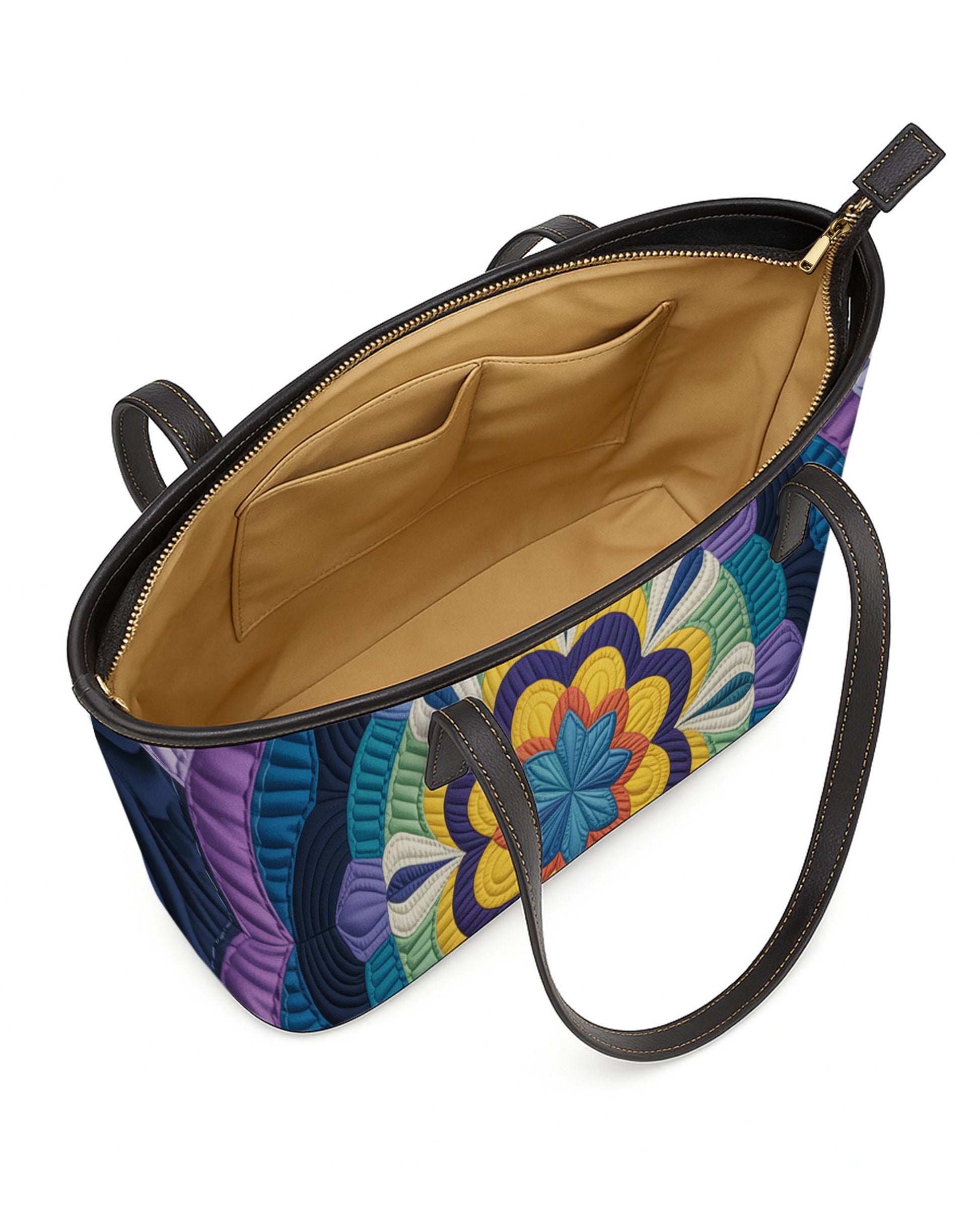 The bag is designed for daily convenience. A spacious, beige-lined interior features slip pockets and ample storage, ideal for organizing your essentials neatly. Secured by a smooth zipper closure, and complemented by adjustable black leather handles, it combines personalized flair with functional design—perfect for everyday outings, shopping trips, or work essentials.